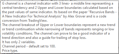 G channel is a channel indicator with 3 lines- a middle line representing a central tendency and 2 Upper and Lower boundaries calculated based on the past values of same indicator. Its based on the paper "Recursive Bands - A New Indicator For Technical Analysis" by Alex Grover and is a code conversion from TradingView.
