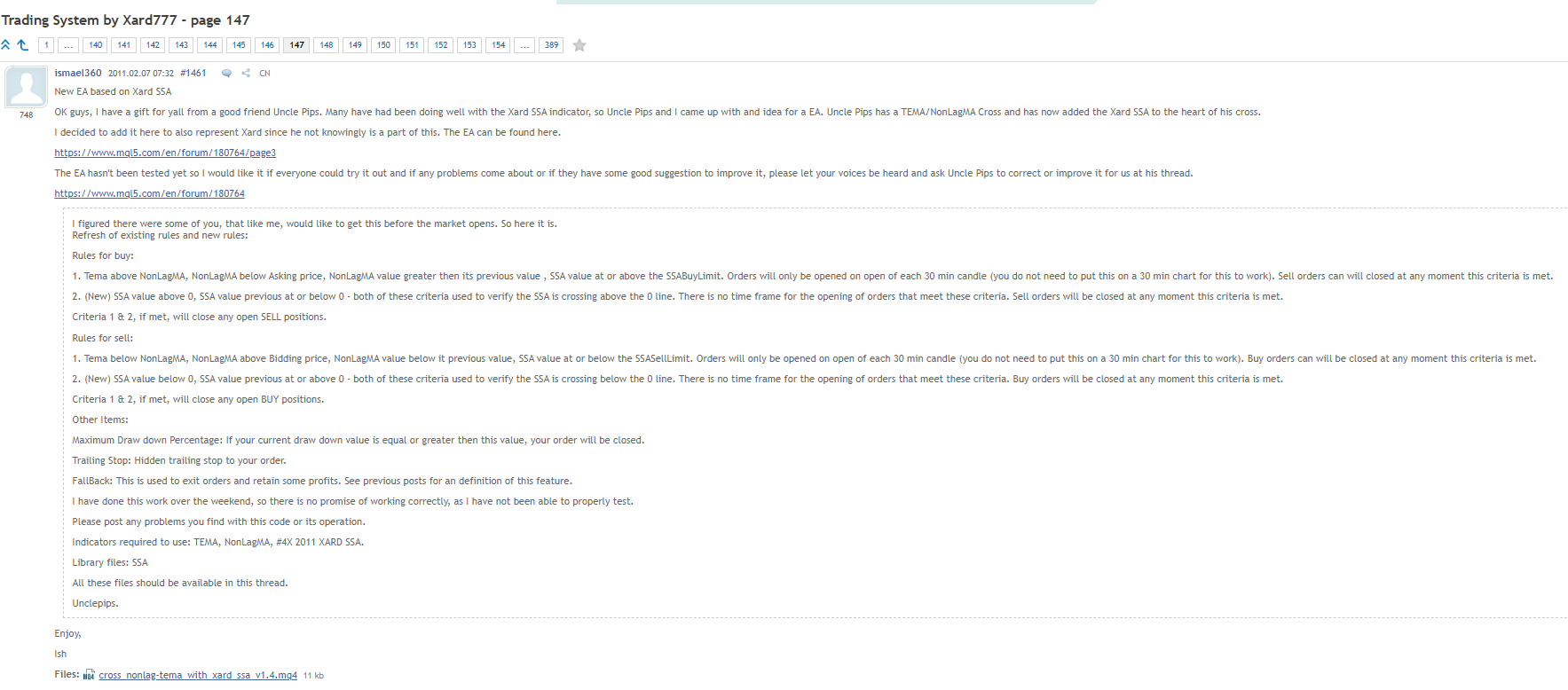 OK guys, I have a gift for yall from a good friend Uncle Pips. Many have had been doing well with the Xard SSA indicator, so Uncle Pips and I came up with and idea for a EA. Uncle Pips has a TEMA/NonLagMA Cross and has now added the Xard SSA to the heart of his cross.