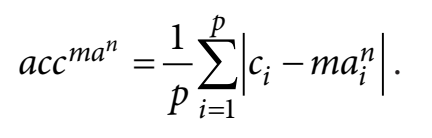 We cannot compare moving averages by period as a similarity measure. To solve this problem we introduce a new comparison measure – accuracy (acc). We define accuracy as the difference between current value and moving average value at that point.