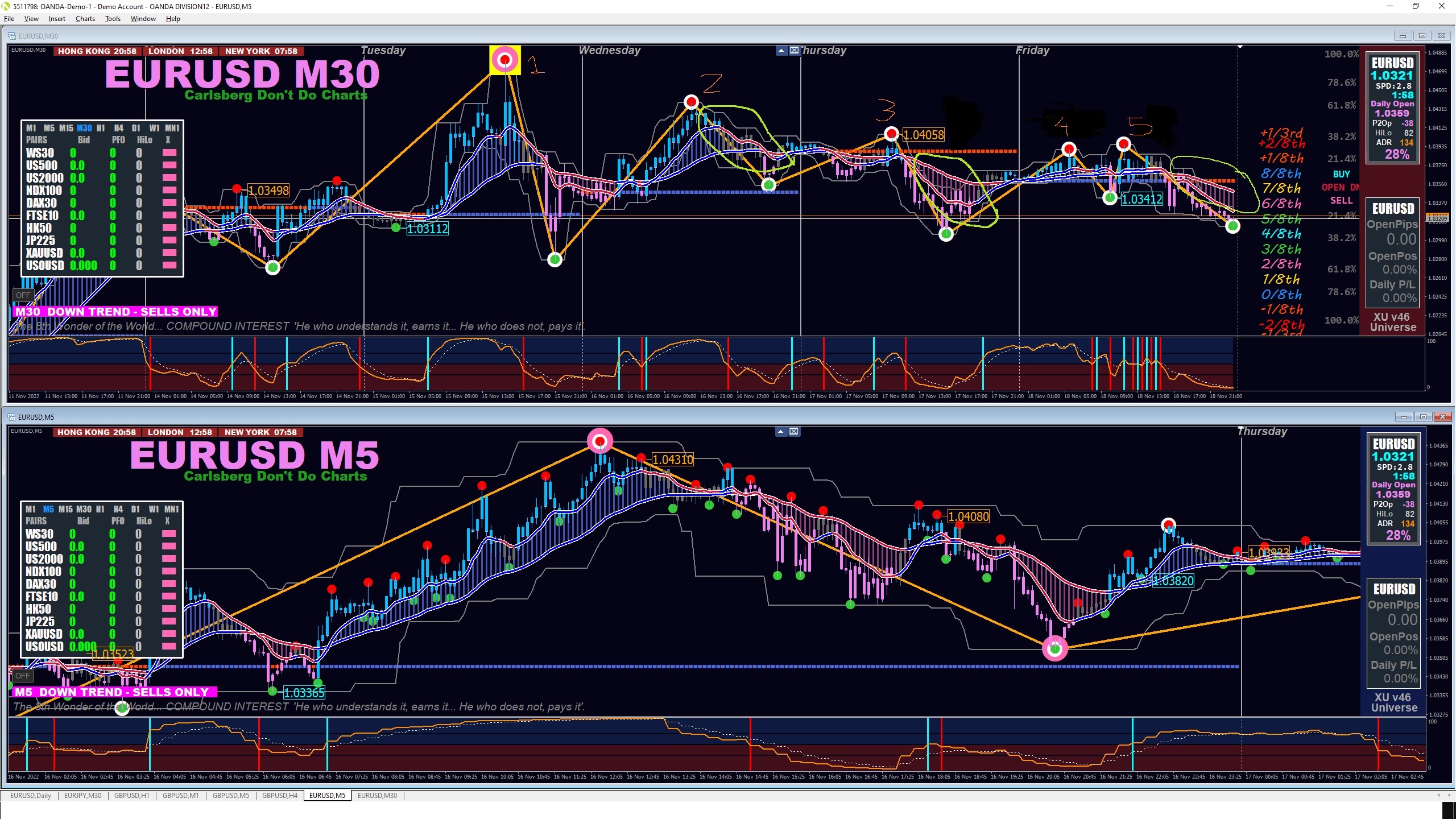 Now i would take the trades (sell) on M5 with the red dots after 3 and 5 when everything is red. I would not take the ones after the 2 and 4 because there is still lots of blue.
