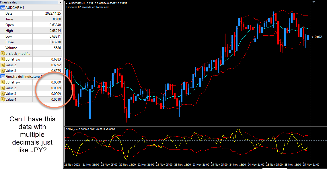 Hi everyone! I kindly need a small change regarding the BBFlat. I would like to be able to see data for pairs that don't have JPY, with more decimals. In pairs that own the JPY, for obvious reasons, the data is more extensive. I need these data to perform some calculations as I would like to build an EA. Thanks to anyone who can help me.