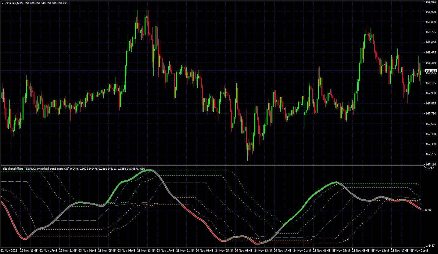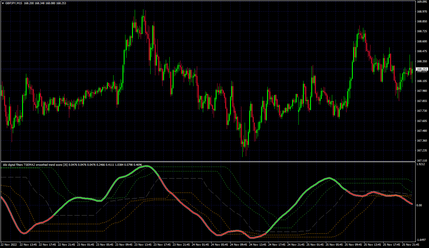 This is an updated double dynamic digital filters trend score with the latest averages used for smoothing the digital filters. With this version there is a choice with colors on middle line cross, upper/lower levels cross, or slope. Screenshot showing smoothing with 35 period triple smoothed ema variation on outer levels cross and lower screenshot is the same except middle line cross.