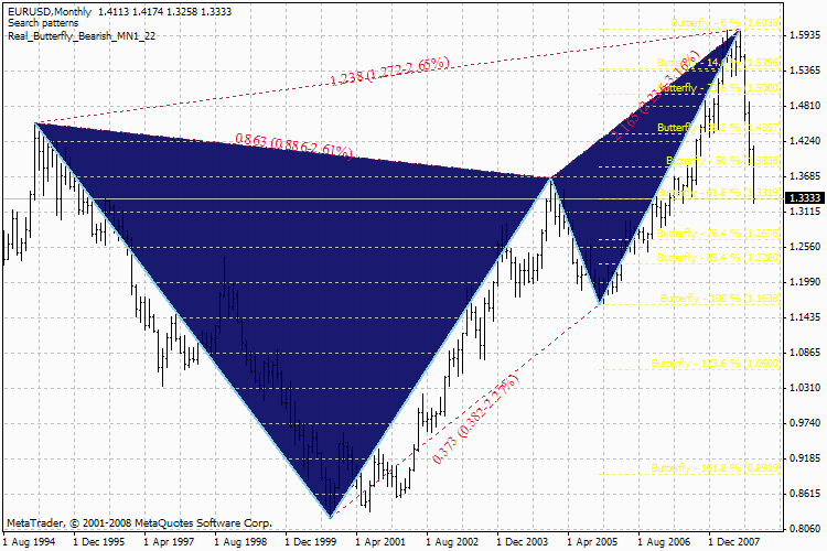 The indicator searches for the patterns, displays the end of the D and C points on the screen.