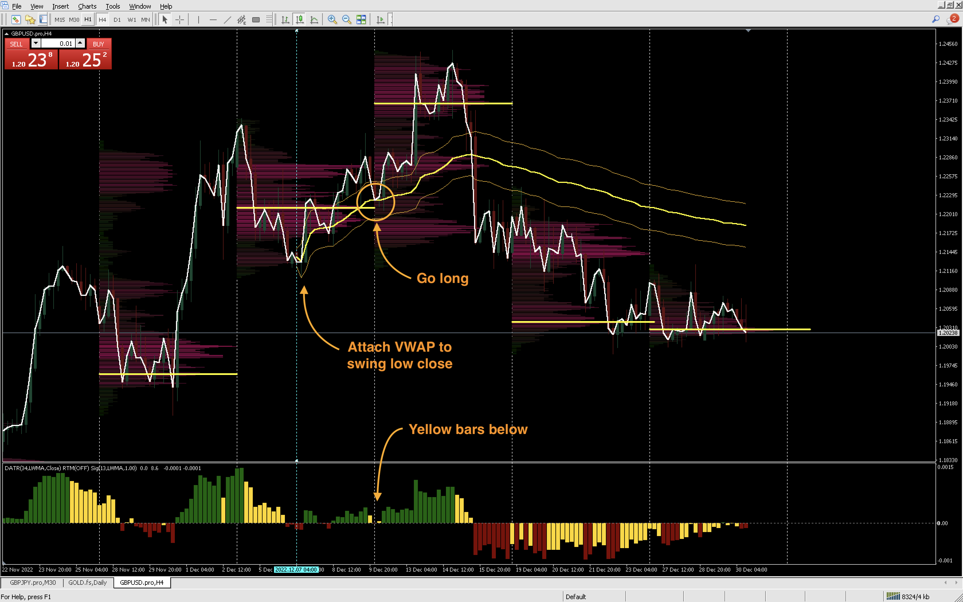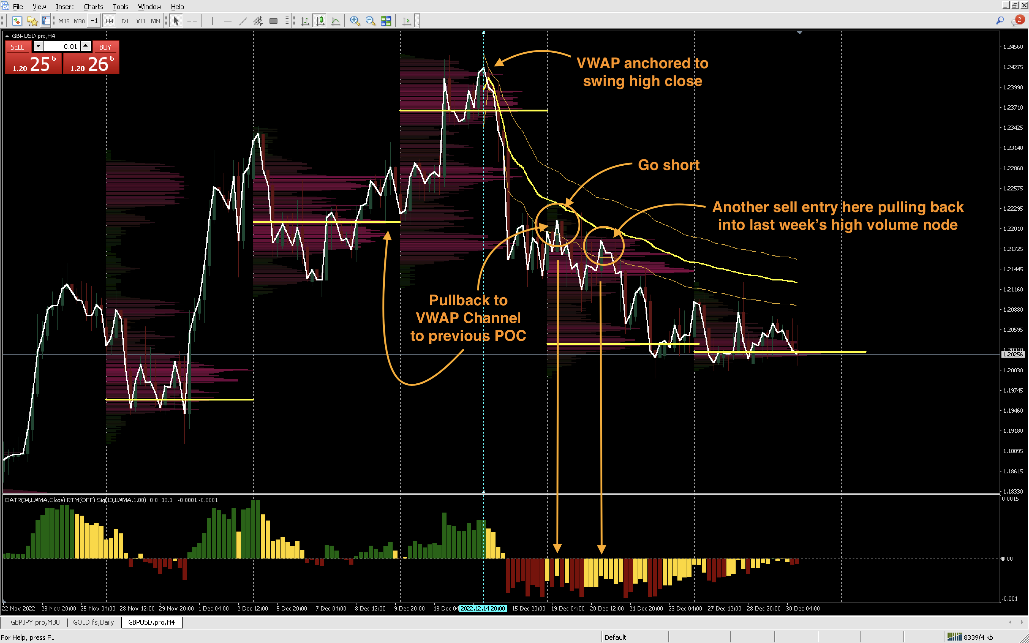 In the image below, I’ve anchored the VWAP to the swing low/close. Price pulls back to the prior weeks POC, taps into the VWAP channel, with yellow bars below, and then makes a new high.