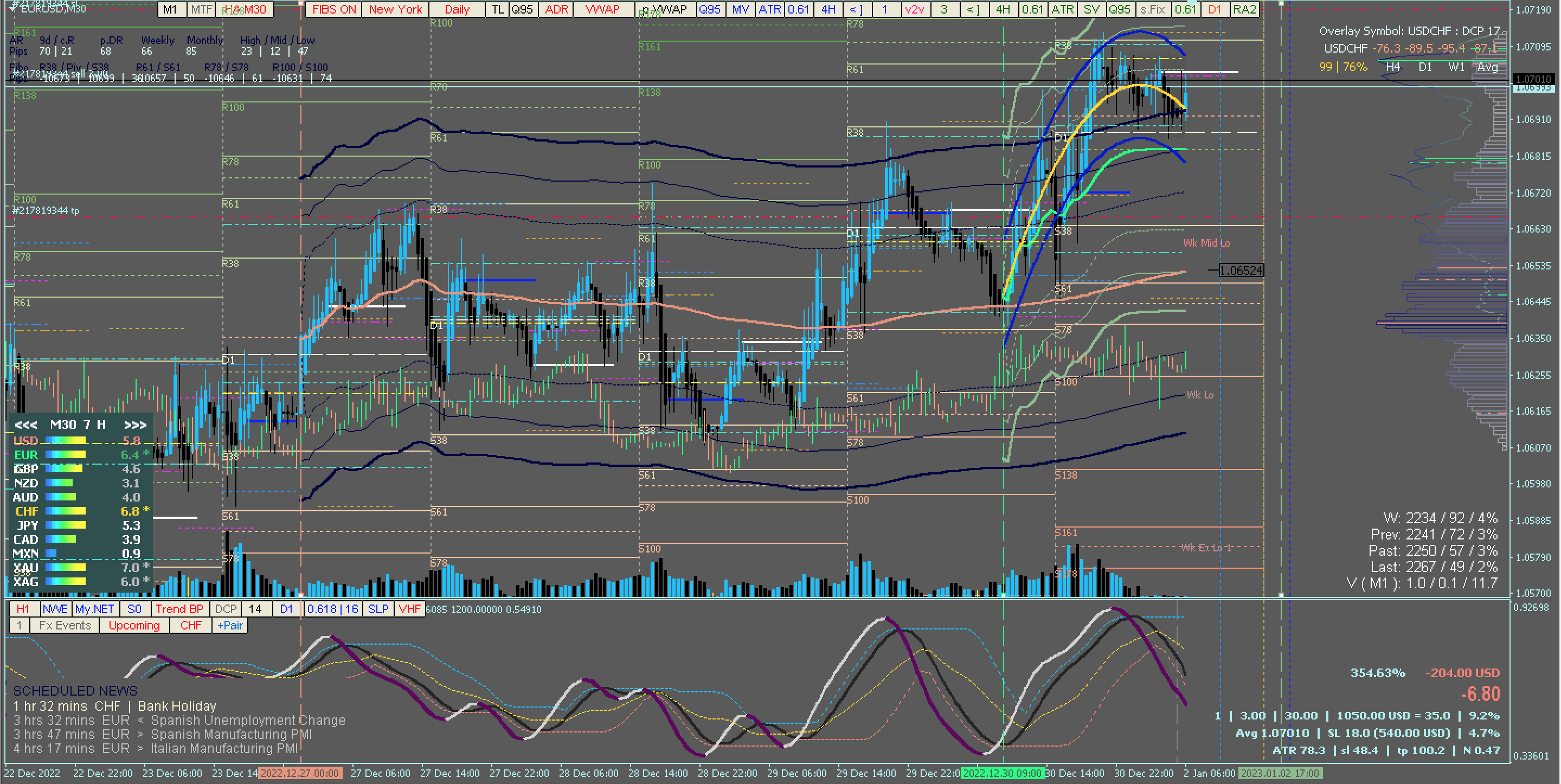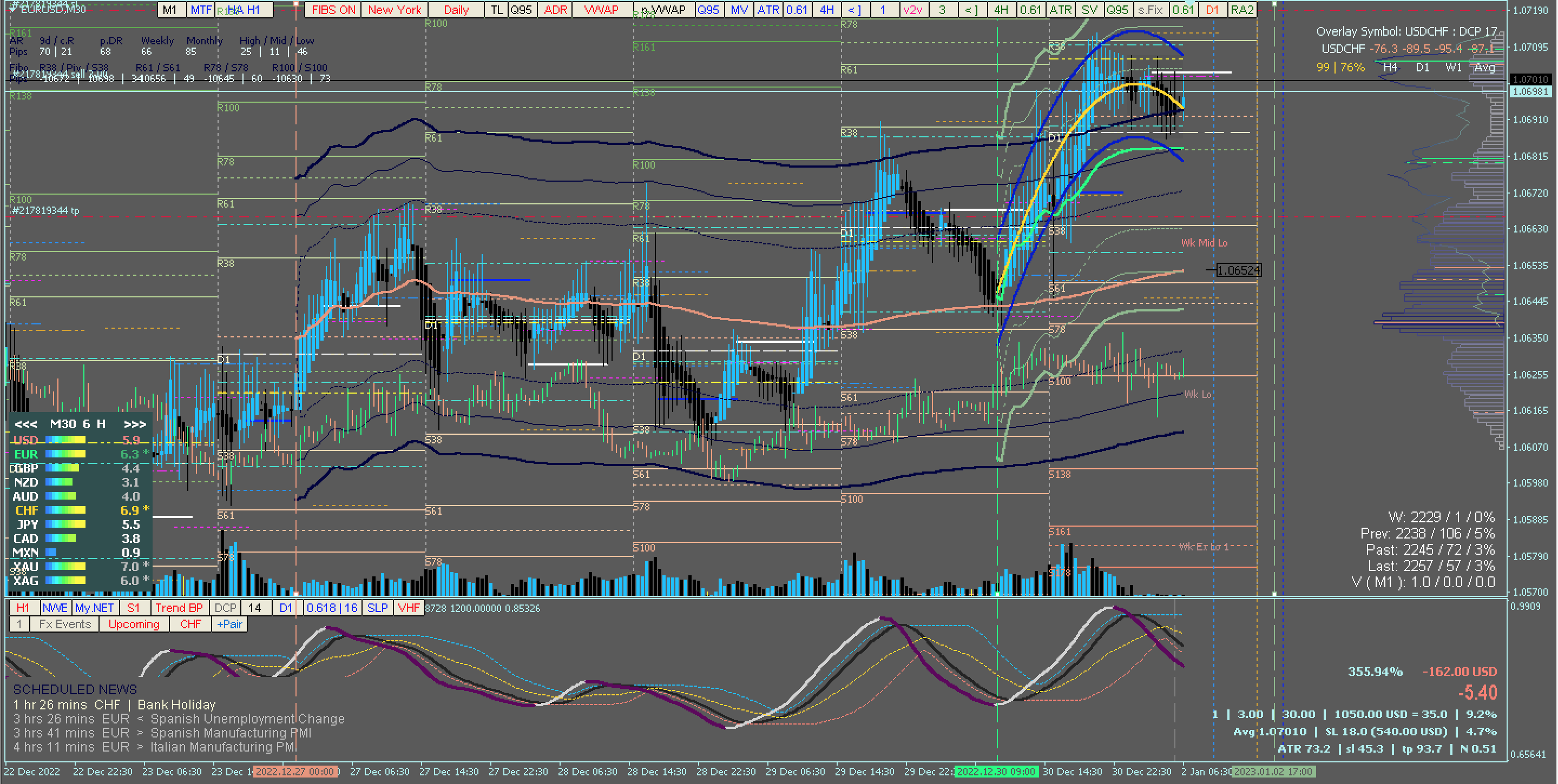 - dynamic NWE (Nadaraya-Watson Estimator) with NET: SmoothStep 0, Trend Biased Price, Period 14, VHF, and in MTF mode H1 TF