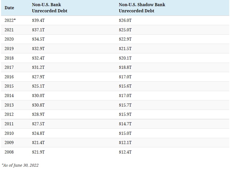 Overall, the value of unrecorded debt is staggering. An estimated $39 trillion is held by non-U.S. banks along with $26 trillion in overseas shadow banks around the world.