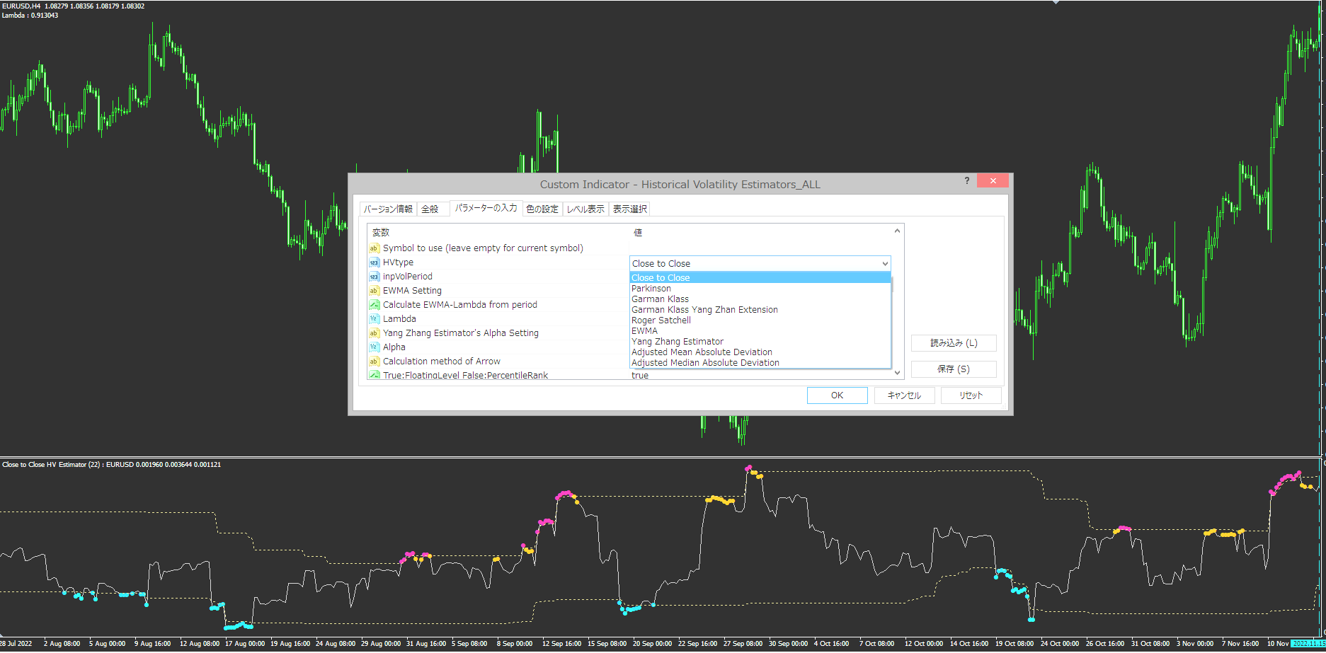 Eight Historical Volatility Estimators are available, Close to Close, Parkinson, Garman Klass, Garman Klass YZ Extension, Roger-Satchell, EWMA, Yang Zhang Estimator, Adjustable Mean Absolute Deviation, and Adjustable Median Absolute Deviation.