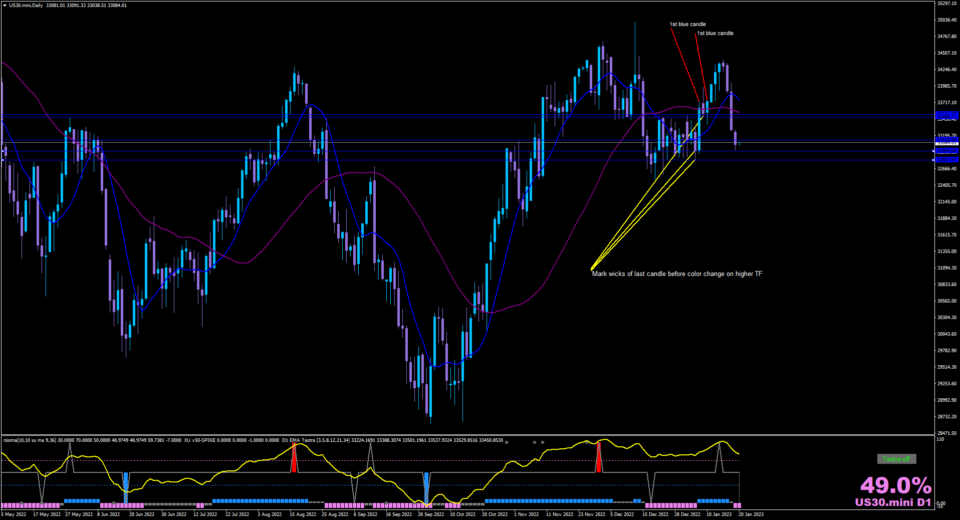 So you mark up the chart on higher TF and trade on the lower, these are Daily/M15. Find the bias (sometimes easier said than done :Shifty: ) and mark the wicks of the last candle before your first bias colored candles...anticipating buys off the blue support lines for tomorrow in these examples on M15.