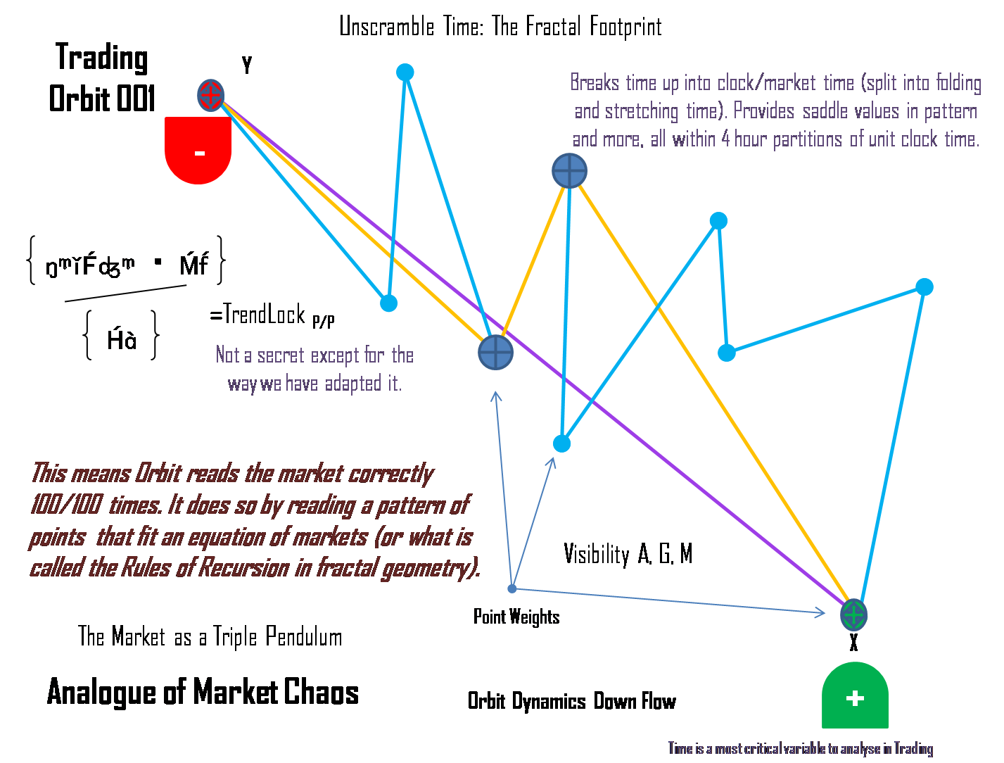 Now it also has to be understood how we breakup time because time is the least accessible variable in trading and the least analysed but not so in fractal geometry indeed just look at the amount of amazing mathematics Mandelbrot unleashed on time in his MMAR model of the market. Mandelbrot shows everyone a key which is that the analysis of time is fundamental to any chaotic model of the market. In our case we are not like Mandelbrot projecting the market by the science but merely reading it by the science and that is a difference, otherwise we submit completely to the master of fractal geometry Mandelbrot.My particular interest in the question of time has to do with the speed of translations and how they change across topologies in specific times. What am I talking about? I am saying that the market shape is never static and moves at all times. Some moves we map may take 12 hours or the whole day going down and just a single bar reversal to recover the last high (called topological transitivity or mixing). To keep things short let me just close by saying we are all freshmen in this business but this thing called chaos theory and its geometry fractal geometry does feel very much like the final solution so please quickly learn to trade only when the risk is zero ---> as Orbit shows.