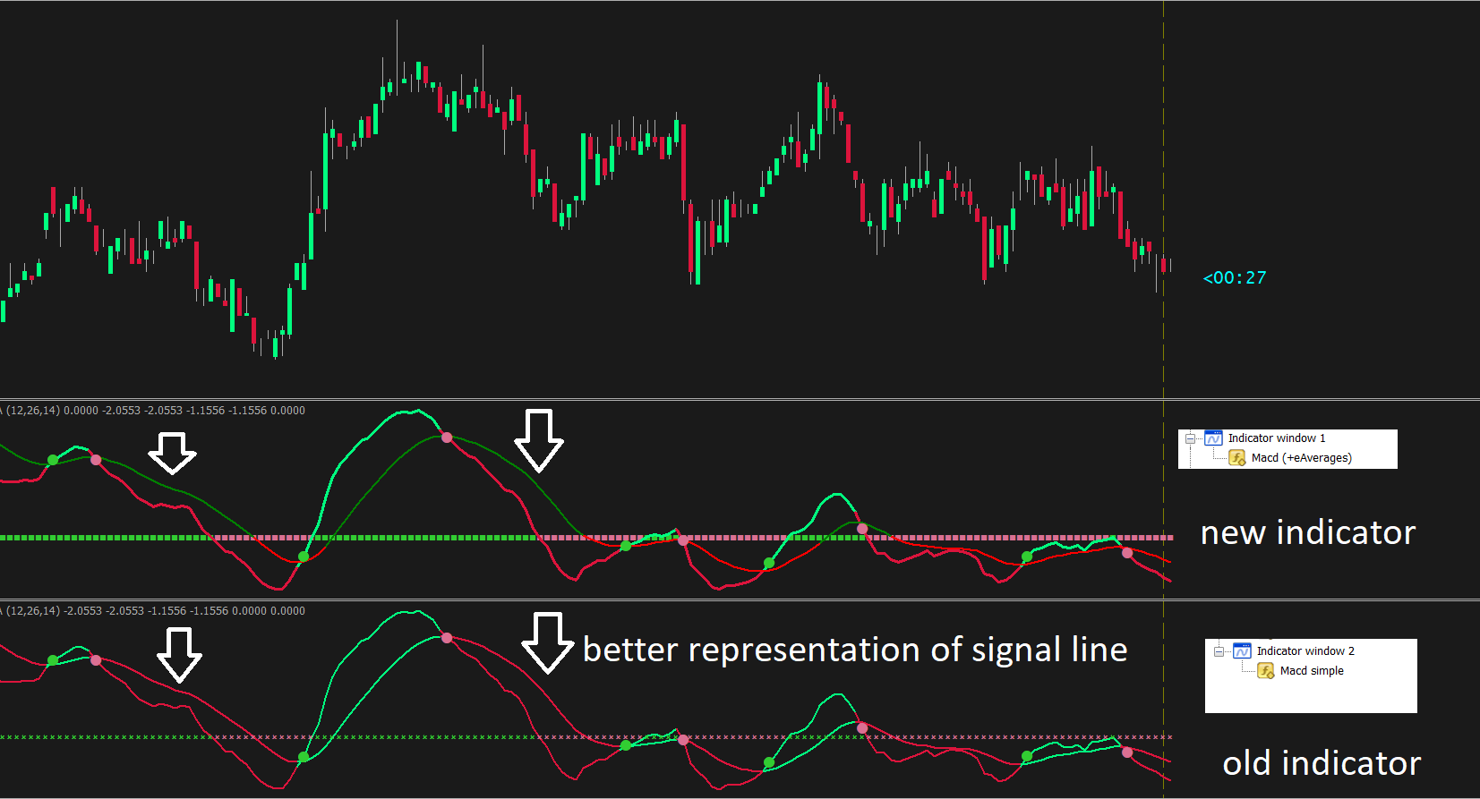 1) when signal line intersects macd line ( as seen in old indicator ) : Macd simple.ex4 indicator