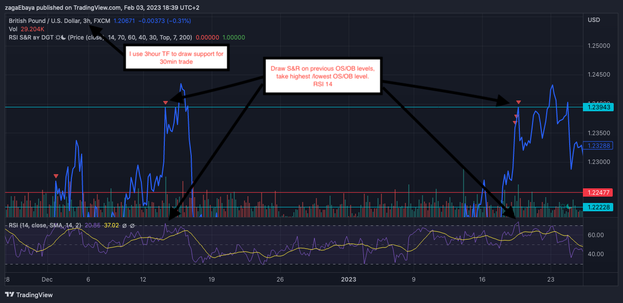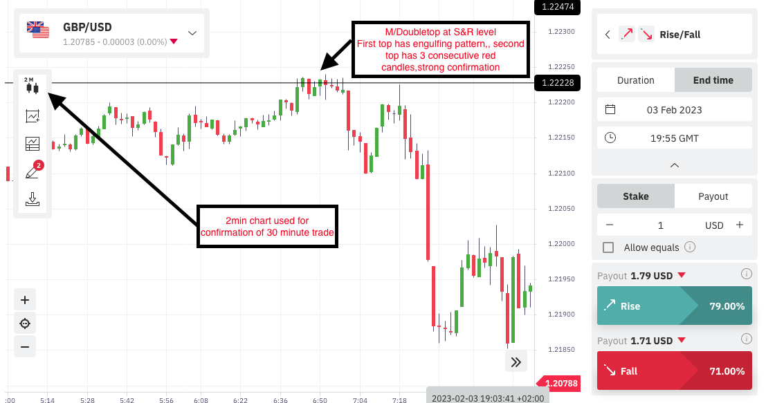 3. I use lower time frame to check for confirmations, for 30min trade i use 2min chart. I look at the price action at the level, im specifically looking for M/W formations