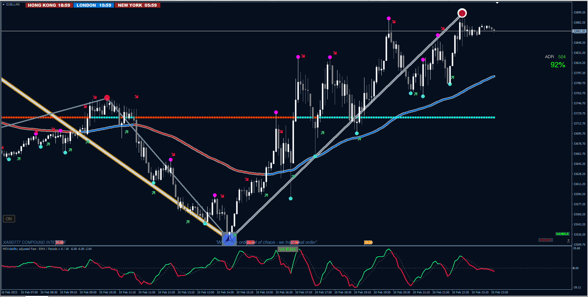 When the candle closes below the base line and a red arrow appears = go short; exit when the green arrow appears.