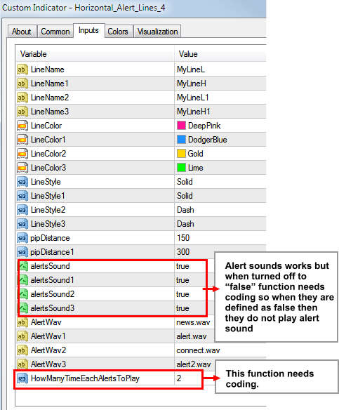 - Switching off any line alert sound by selecting "false" is not coded.
