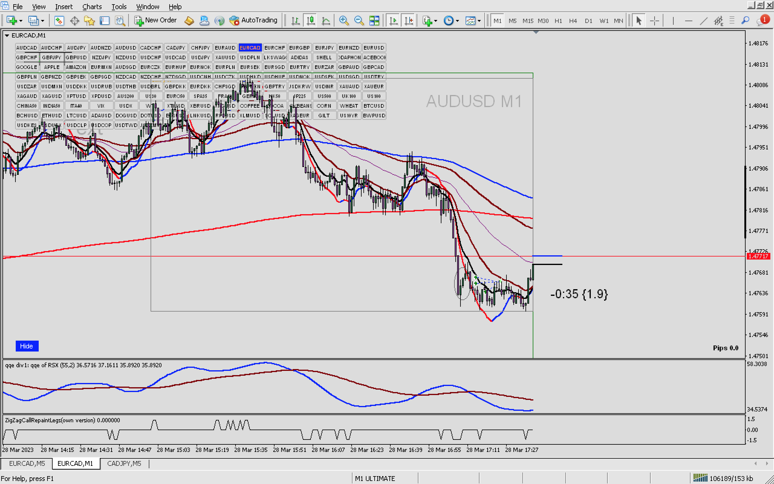 Market always will react like this, this was outstanding discovery for me when constant watching price for looong time,almost I can "feel" next 5-10 minutes , "fake" 4 minutes up, than sharp down toward poi ,than sharp move up as predicted, i was in dd first and spreads was a bit high and plus higher tf I did not like to much as there is so many poi down to be reached,but again, for reaching at least ema20 on 1min tf was nice,so when reaching ema 20 on 1min tf I was in profit and I do not want to open more positions ,so closed all as usually price react from ema 20 and collapse a bit before again explosion toward ema 50/200 if poi is valid...charli wrote: Wed Mar 29, 2023 1:30 am eurcad,possible explosion towards ema 200,i already took some pips