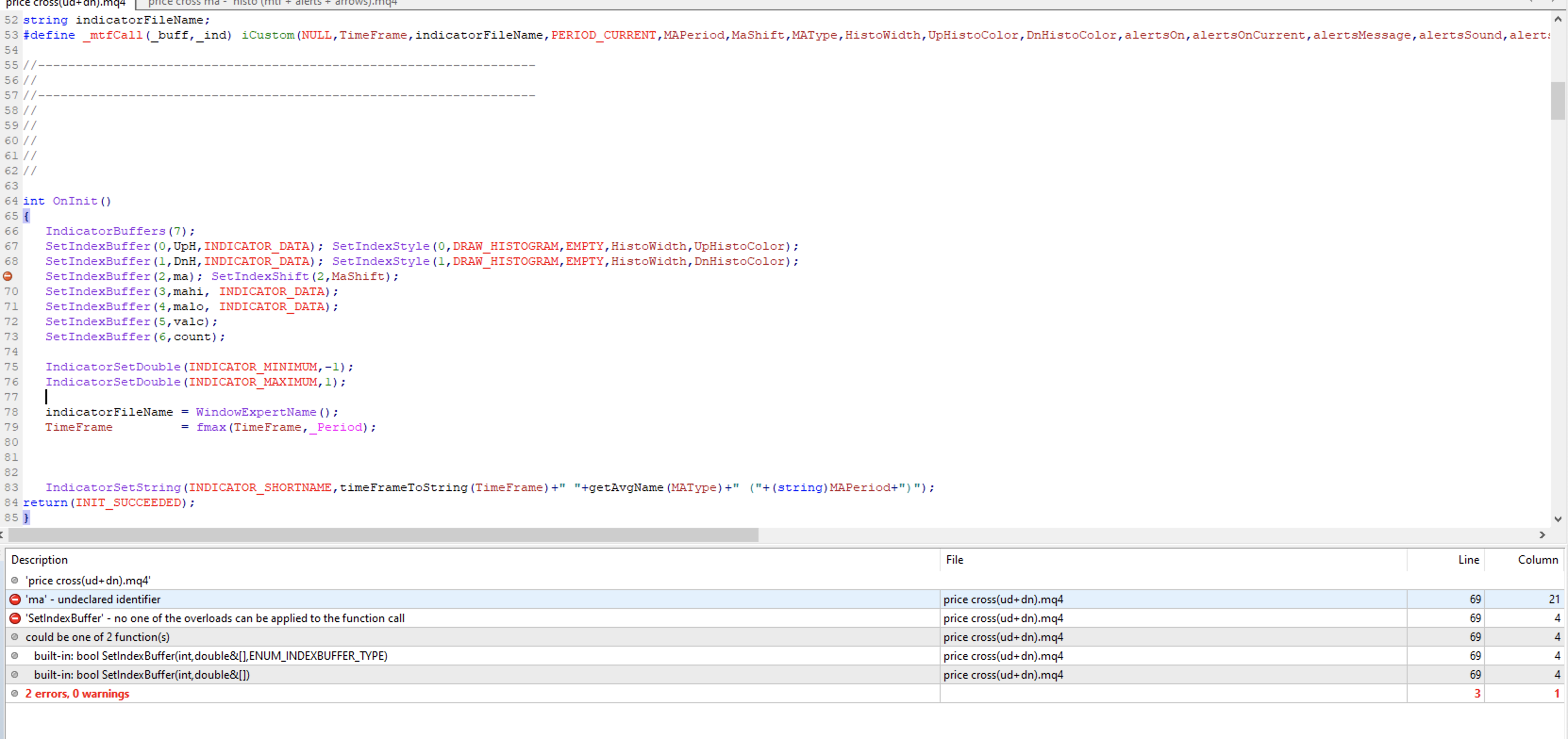 I'm trying to add MA Shift to the Price Cross(Up+Dn) indicator on my own. I'm not a coder, but I'm trying to copy the code from the original indicator (price cross MA histo; below). Can someone help me because I don't know what's wrong. I added the same line of code and in theory, I thought it should be simple. Anyway, any help is much appreciated!!!!!!