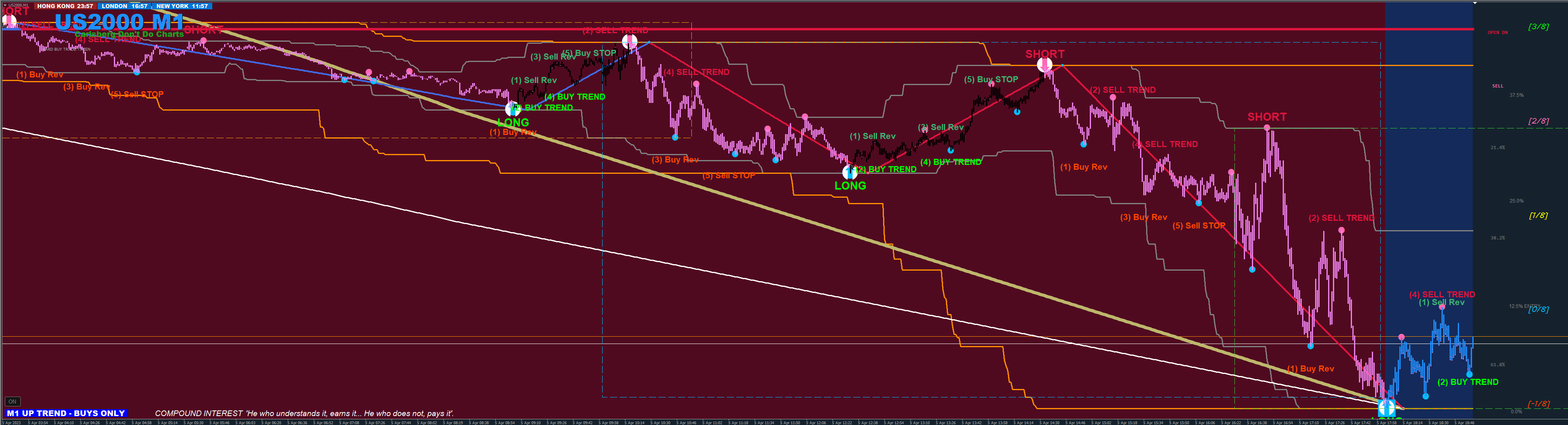 You can see in this 1min chart of US2000 that Price is Below the Daily Open Line. The SHORT text & Arrow Dot represents a Golden Nugget DOWN move.