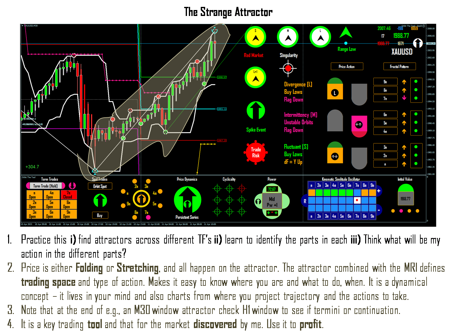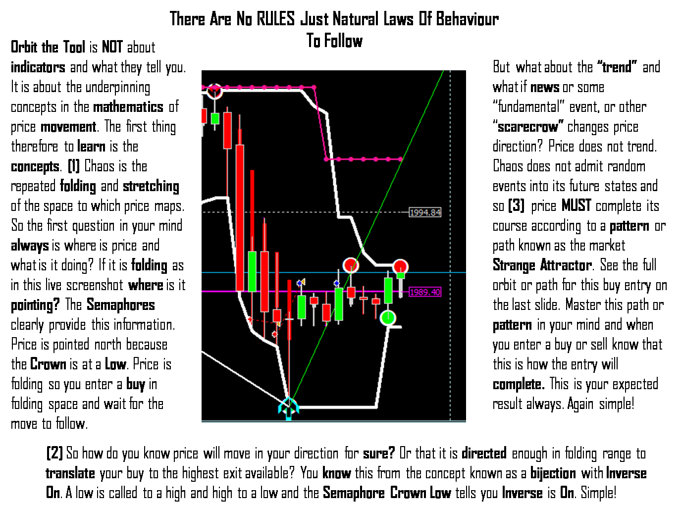 For example, @ ImpLaNT gets it to an expert level already and can in fact teach it well (in my view). Chaos and fractal geometry are underpinned by "natural" laws and laws not unlike those for how GRAVITY works and so when you see it you know it (but you must first understand the concept - what goes up must come down or you will miss it when you see it). For example, please somebody tell me this "What are the rules in and the correct steps for throwing a ball up and watching it fall?" It is the same thing with concepts such as Inverse On, Strange Attractor, etc. It is because people have refused to see the simplicity and naturalness of it all that there is a block in the required understanding (that it is NOT about indicators or some "special" technique but the science or behaviours that make the system (market), the way it is and knowing those behaviours - or laws). There can be nothing simpler in trading than trading by Orbit ----there are no rules required and yet all the patterns and behaviours are consistent and true. @ ImpLaNT you know the concepts very well help them see that it is as I spell out in the slides below and nothing more.