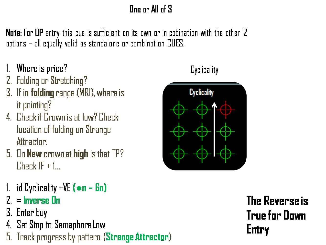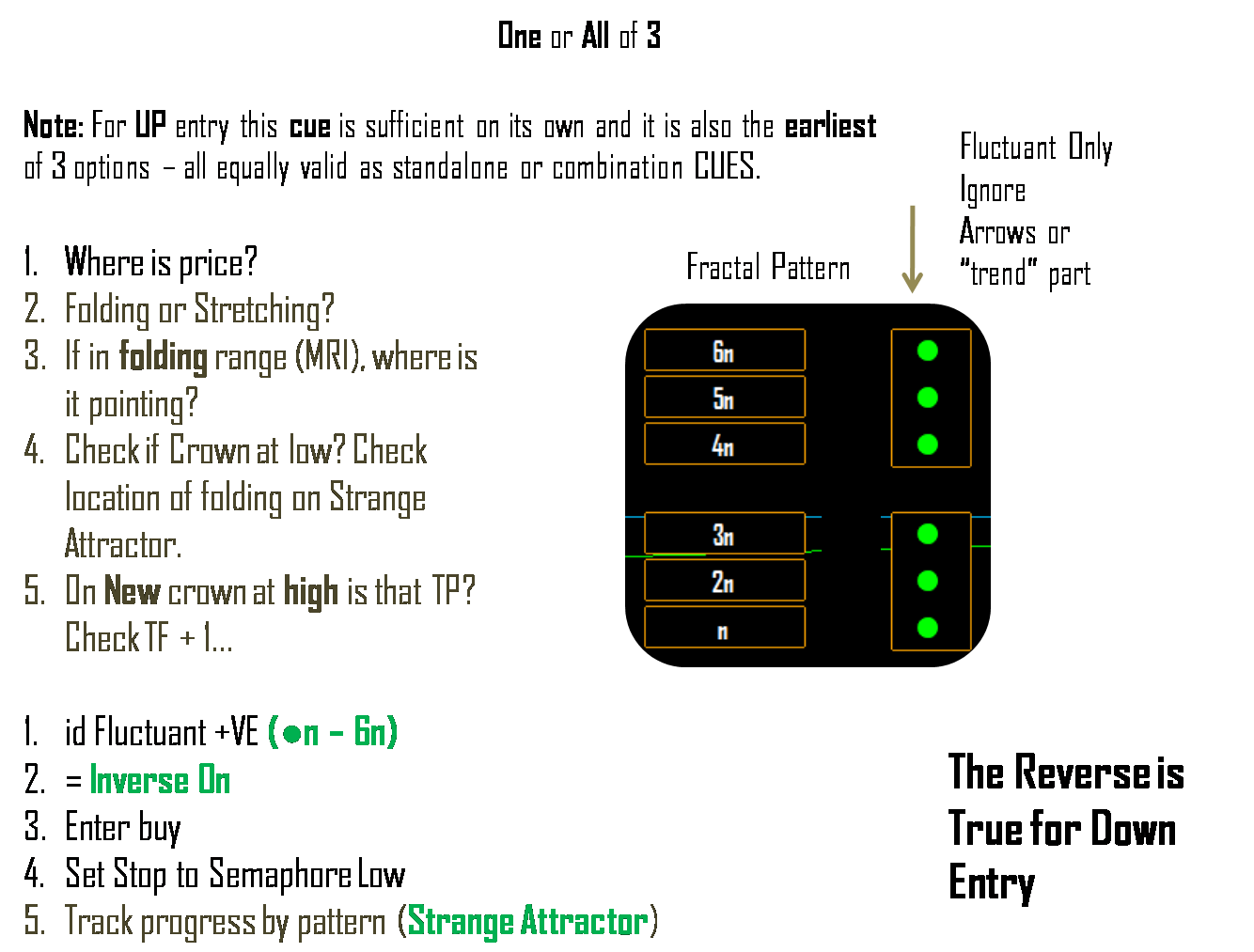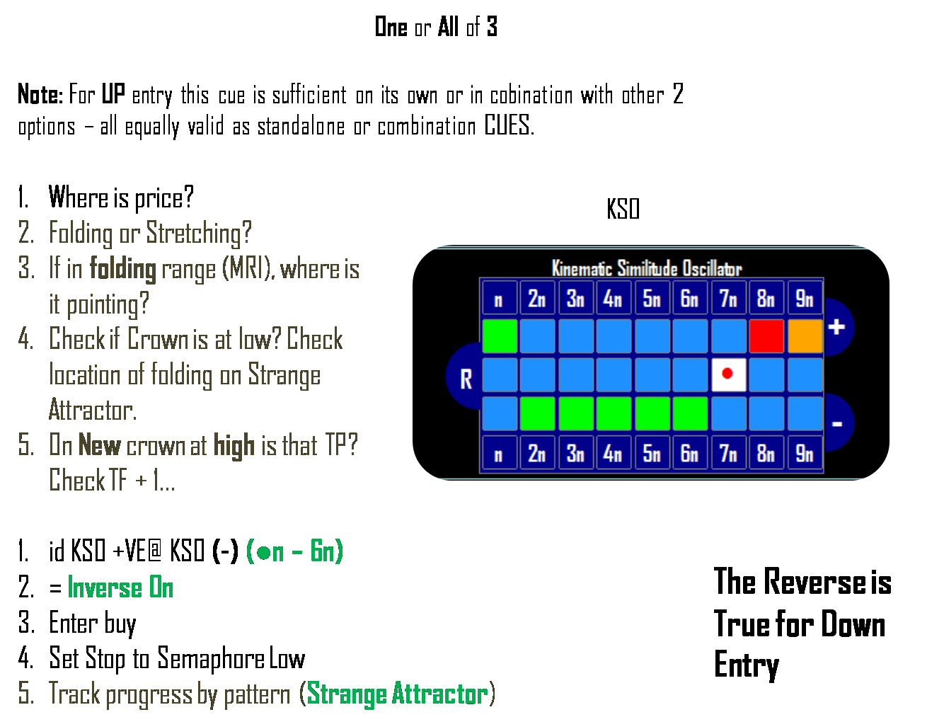 I agree with @ ImpLaNT that @regit's scheme is interesting and aught to be useful. But I suggest that instead of "haunting" for patterns in an attempt to find hidden combinations of graphical stimuli that might lead to consistent trading cues from the Screenface - let us instead focus on confirming with @regits scheme (as well as the snaps), what we know works consistently already. My reasoning is simply as I told everyone before - no two sequences are the same EVER, regardless of scale. So it is doubtful that "haunting" for some hidden set of visual cues will pay off that much (given no 2 sequences are the same ever). This is why we use the notion of phase synchrony to indicate the Inverse On command (because nothing else will turn out consistent). What do I mean by this? See slides below so that we can use snaps and video to a) confirm the CUES below (which are already consistent and accurate), and b) evaluate and discuss their various contexts in terms of applying them consistently by different traders in trading Orbit the Tool (that is, what is the common experience with the cues and why would they be complex to understand for others and not me or @ ImpLaNT)?