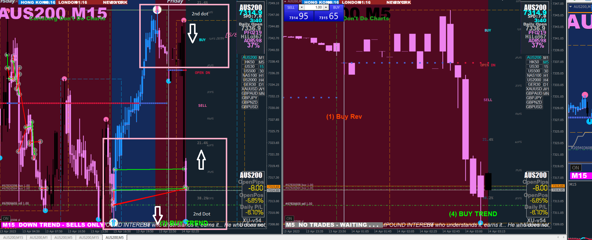 What I did was trade from where price was when I got started - Price can go up, down, or consolidate, but 'usually' there is movement in AUS200 at the open for 2-3 hours. You must be able to see the white dot (blue arrow on the M15 chart - what would be a confirmation of an upward move? A 2nd dot (smaller blue dot).