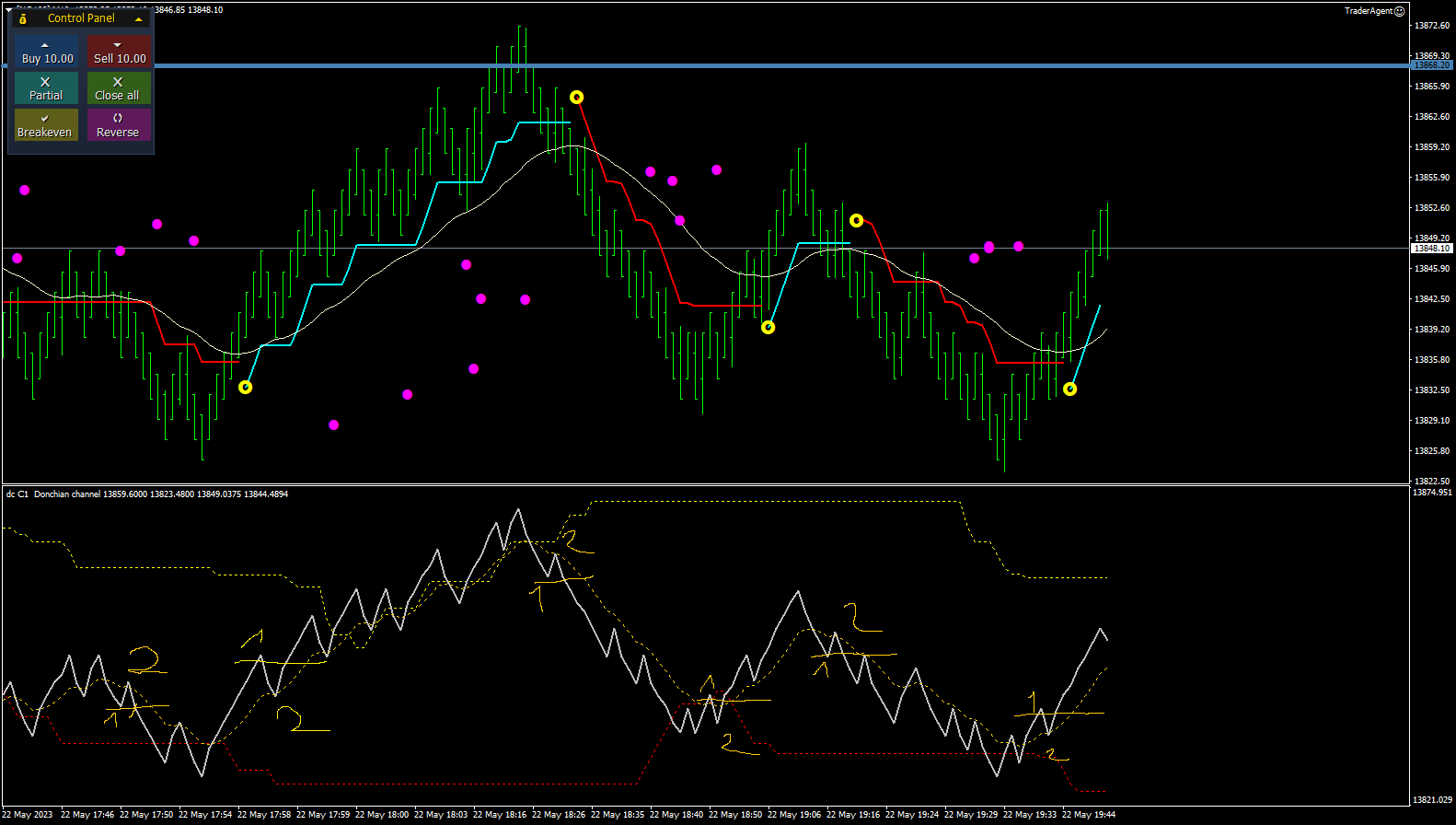 i am wondering if it would be possible to include into the donchian indicator a LL / LH /break or HH/ HL/ break (1/2/3 pattern) alert