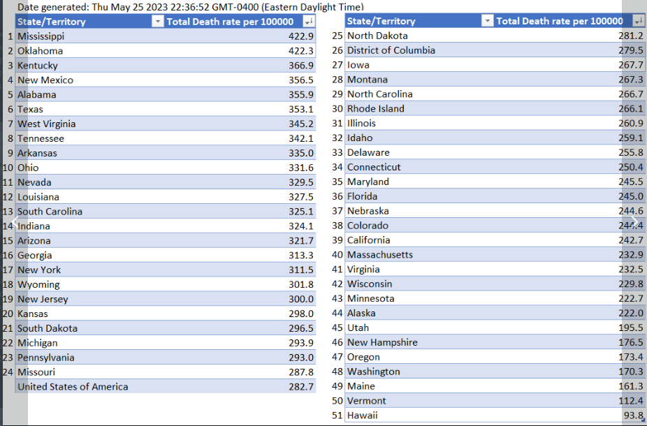 CDC now has age-adjusted COVID-19-associated deaths by state, cumulative from January 1, 2020 through May 20, 2023.