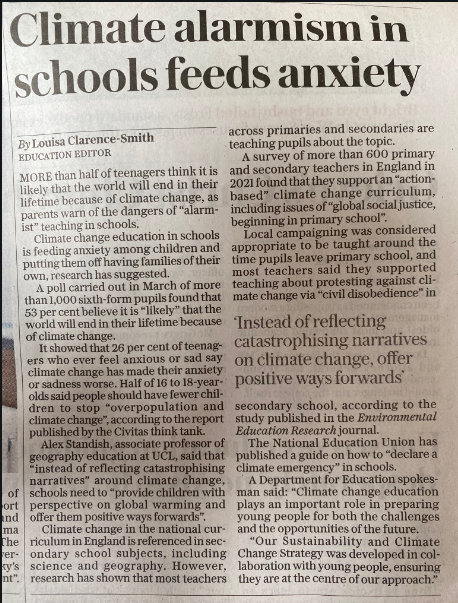 A poll carried out of more than 1,000 sixth-form pupils in March found that 53 per cent believe it is “likely” that the world will end in their lifetime because of climate change.
