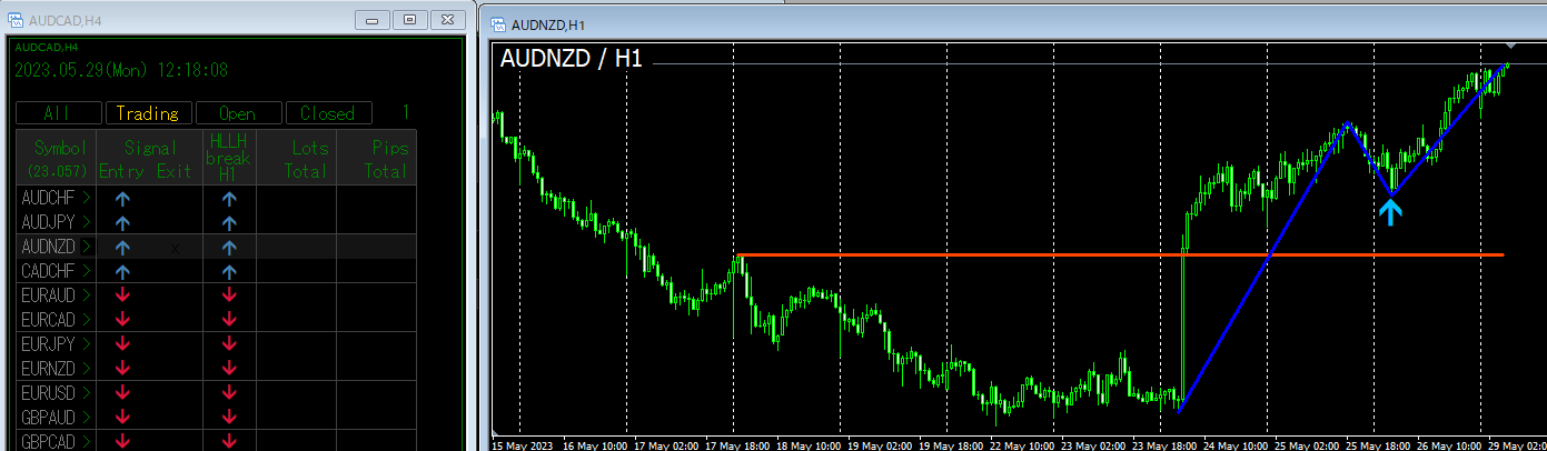 Displays the signal in the direction of the break of the higher low/lower high.