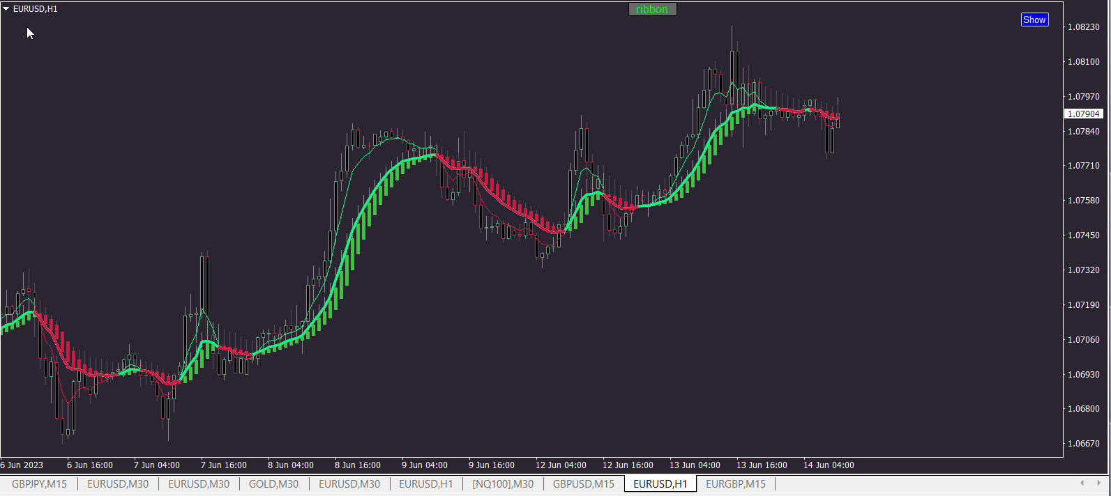 PS: For the version with Heiken Ashi Candlesticks, please see: Ribbon MA with Heiken Ashi.