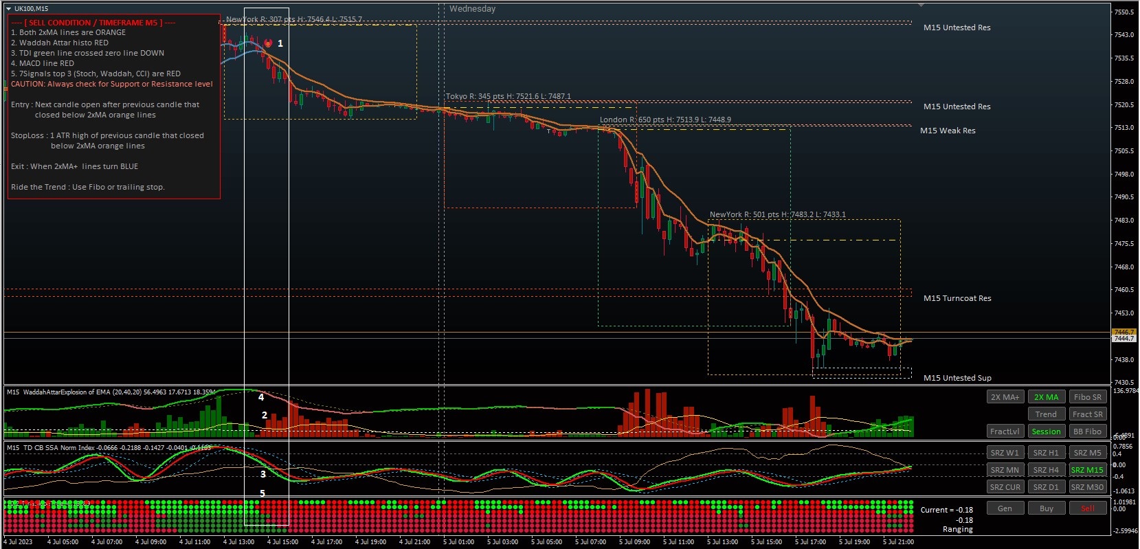 I enter a trade when all conditions are met (as described in the screenshot). I normally trade on lower timeframe (M5 and M15) where most of time the bars are choppy. So, on lower timeframe, I exit a trade when one timeframe higher 2xMA changed to opposite color. If on H1 and H4, 2xMA on current timeframe color change should be okay to be use as exit.