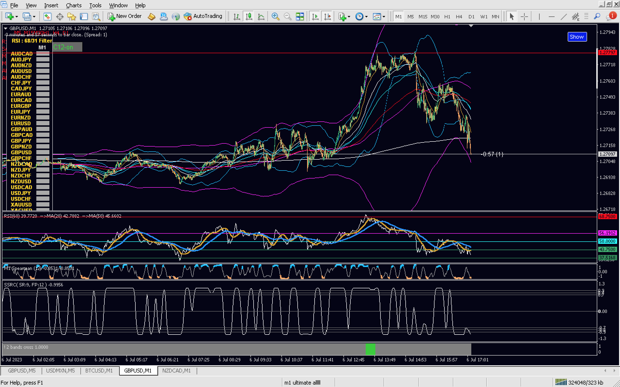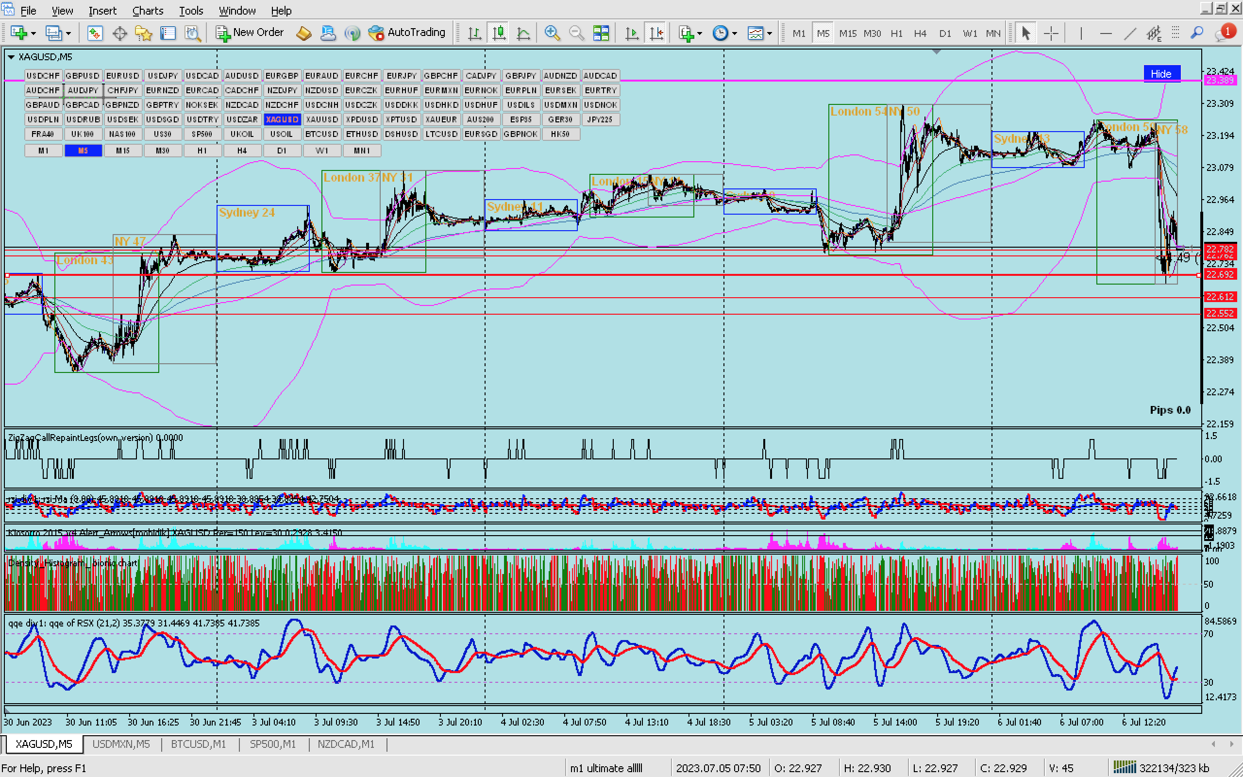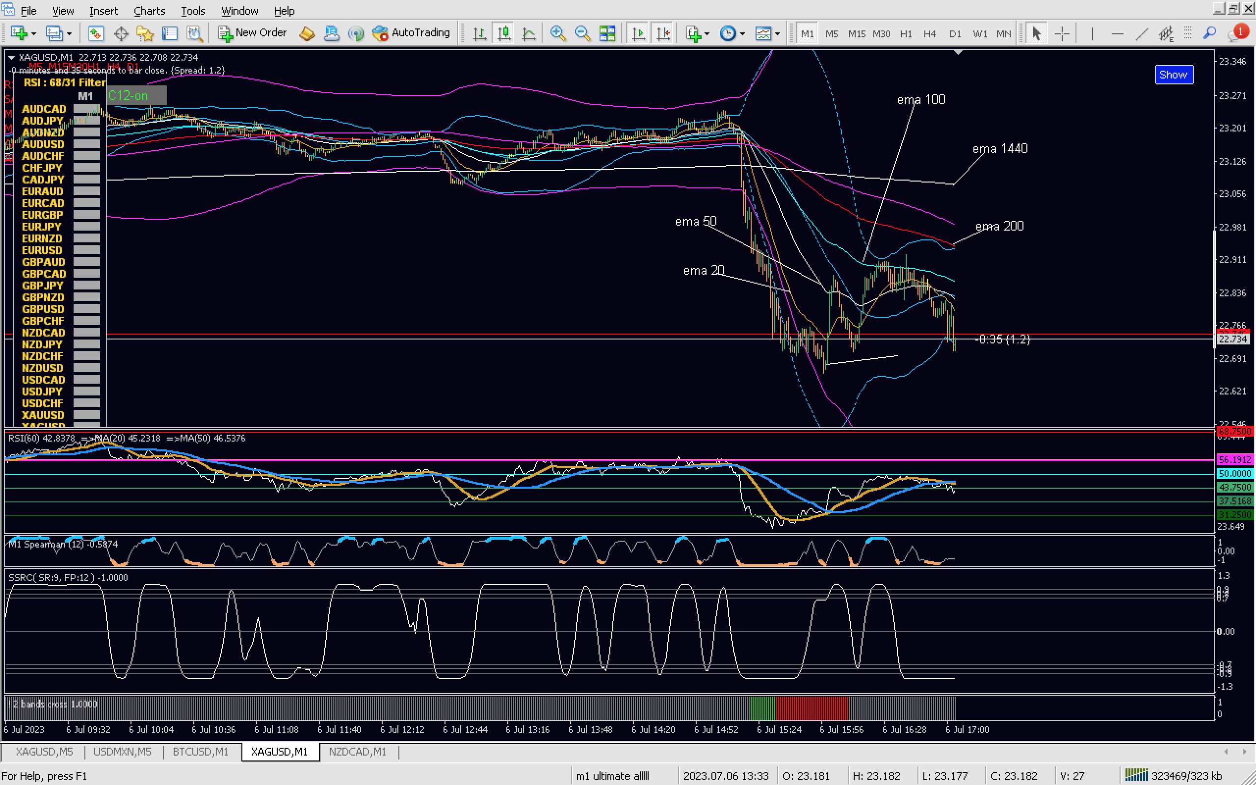 In this case I was super sure that will reverse at least till ema 20,if you look area on the left on m5 tf you will see price hover at exact area around 22690....Plus m1 reached lvl 31.250 then goes up a bit tested ema 20 m1 ,than collapse tricking us that will go further...As SL I am using it, but leaving space for price ...Same goes for gu,kill zone was up at lvl 1.2800 but price reached 68.750 rsi 60,those lvls are very interesting to observe in my experience...RplusT wrote: Thu Jul 06, 2023 11:47 pm Just curious about your first chart. What makes you so sure that PA will reverse, as I can see you got already several orders and would keep buying (buy limit) if PA moves further down. You don't use SLs either??