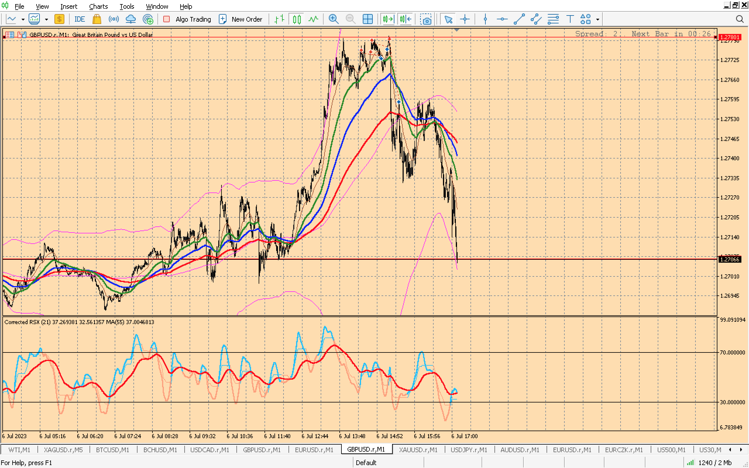 In this case I was super sure that will reverse at least till ema 20,if you look area on the left on m5 tf you will see price hover at exact area around 22690....Plus m1 reached lvl 31.250 then goes up a bit tested ema 20 m1 ,than collapse tricking us that will go further...As SL I am using it, but leaving space for price ...Same goes for gu,kill zone was up at lvl 1.2800 but price reached 68.750 rsi 60,those lvls are very interesting to observe in my experience...RplusT wrote: Thu Jul 06, 2023 11:47 pm Just curious about your first chart. What makes you so sure that PA will reverse, as I can see you got already several orders and would keep buying (buy limit) if PA moves further down. You don't use SLs either??