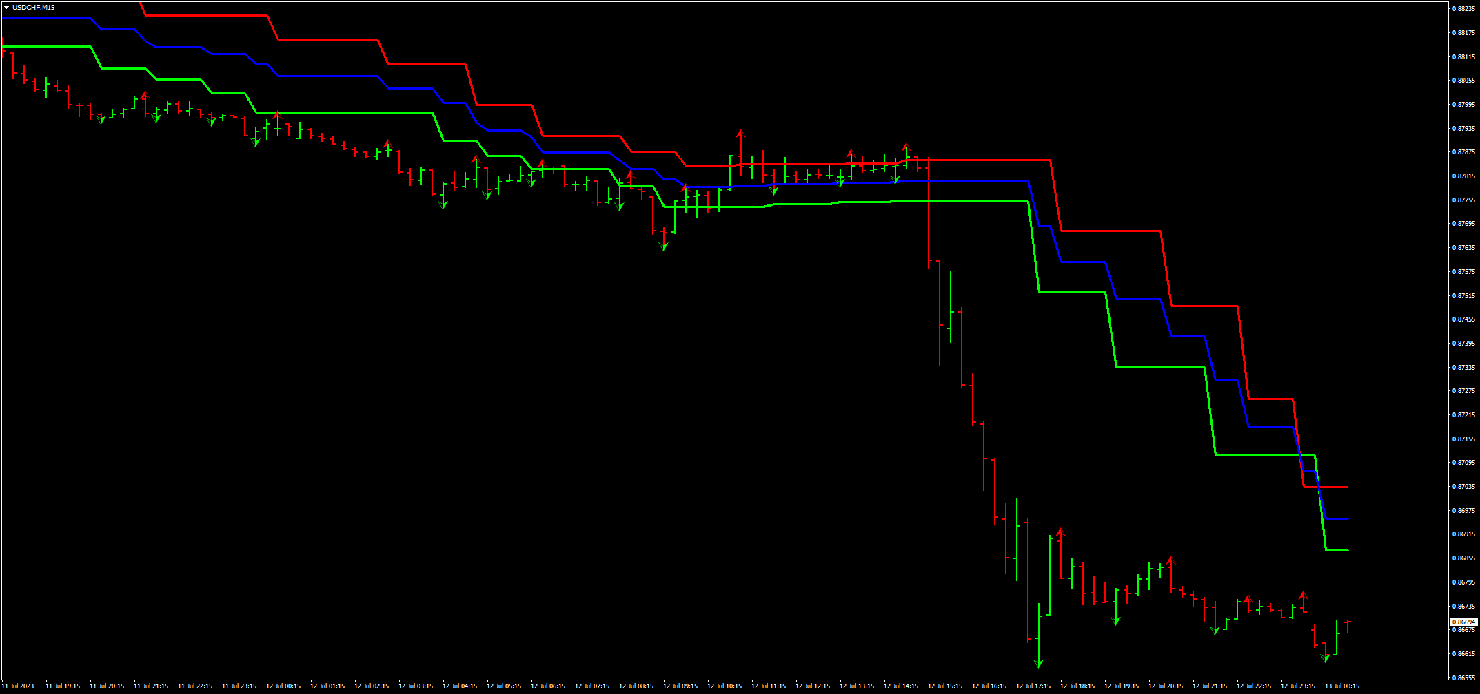 Could anyone create a histogram that alerts on the breakout and paints green when price is closing above the red line vice versa for sells and paints grey when price closes in the middle of the included indicator.......the included indicator builds two envelopes on the mean prices of the pre-defined number of upper and lower fractals and the central line.
