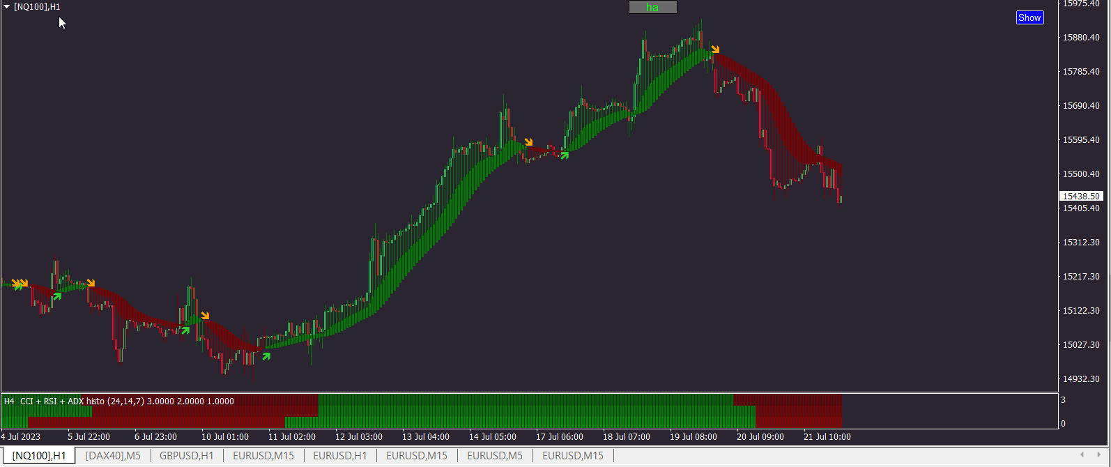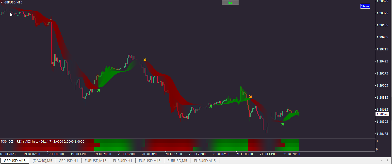 The Heiken Ashi V slightly differs from the original formula as it attempts to reduce noisy signals.