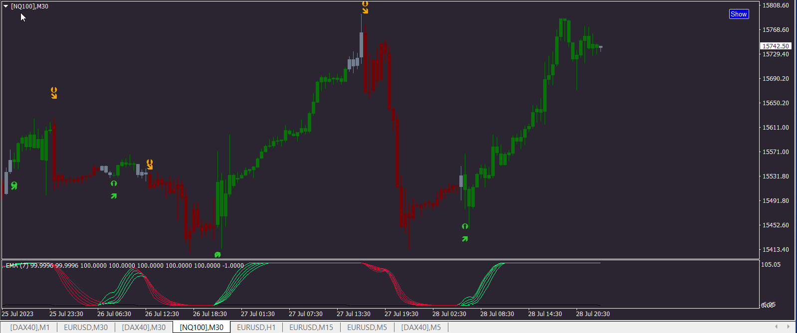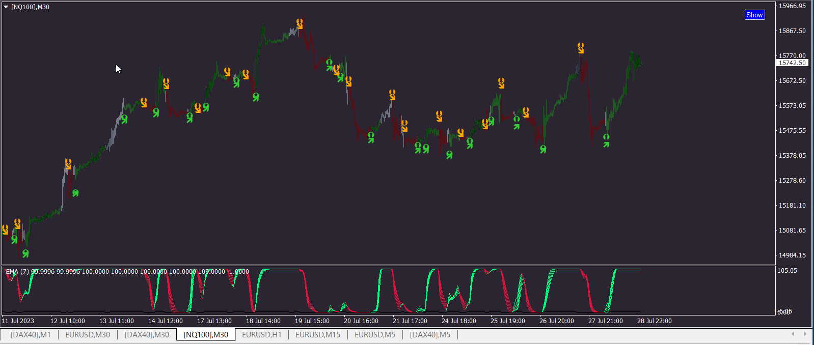 Cross of 5x RSI indicator set: Subwindow + Candlestick Overlay & "Neutral" Candlestick highlight