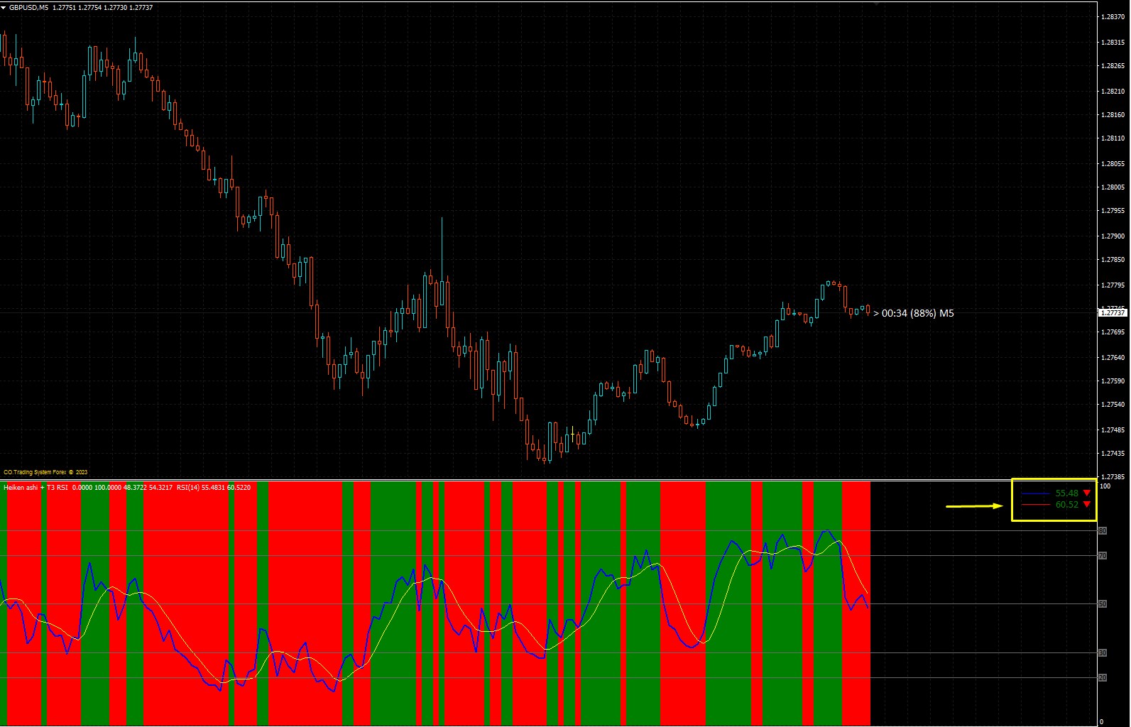 Dear mrtools! Thank you very much for the work you have done. Be so kind as to add this information, I highlighted it with a yellow frame RSI MA LABEL indicator. Thank you!mrtools wrote: Wed Aug 02, 2023 5:24 am Combined the two indicators. The background is based on heiken ashi and the lines are a rsi with a t3 signal line. There are 8 types of rsi to choose from Cuttler's RSI, Emphasized RSI, Ehlers' smoothed RSI, Harris' RSI, Rapid RSI, regular RSI, RSX, or Slow RSI.
