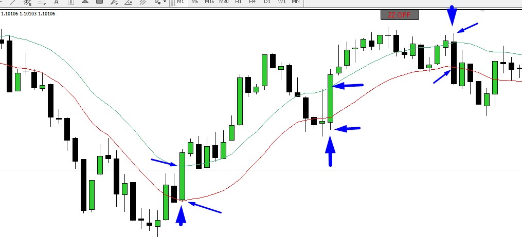 if the bullish current bar close price > high price line & current bar low price < ma low price line - UP arrow