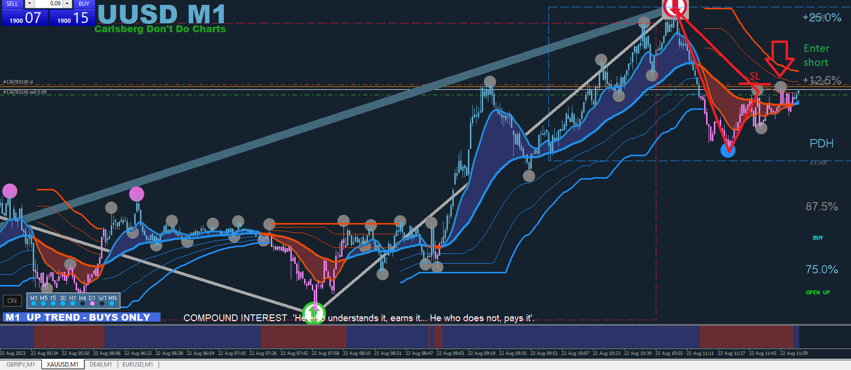 Finally, a third second dot occurs (the sixth dot from the green arrow) and the lines are blue, matching the candle colour, indi in the sub-window and MA. This is the ideal point of entry and you set SL to the previous 2nd dot and TP to an ADR level of your choosing (38.2% is often a safe bet on indices assuming the market is trading and not ranging. It often goes to 61.8% too). Or when a big pink dot/red arrow presents itself.