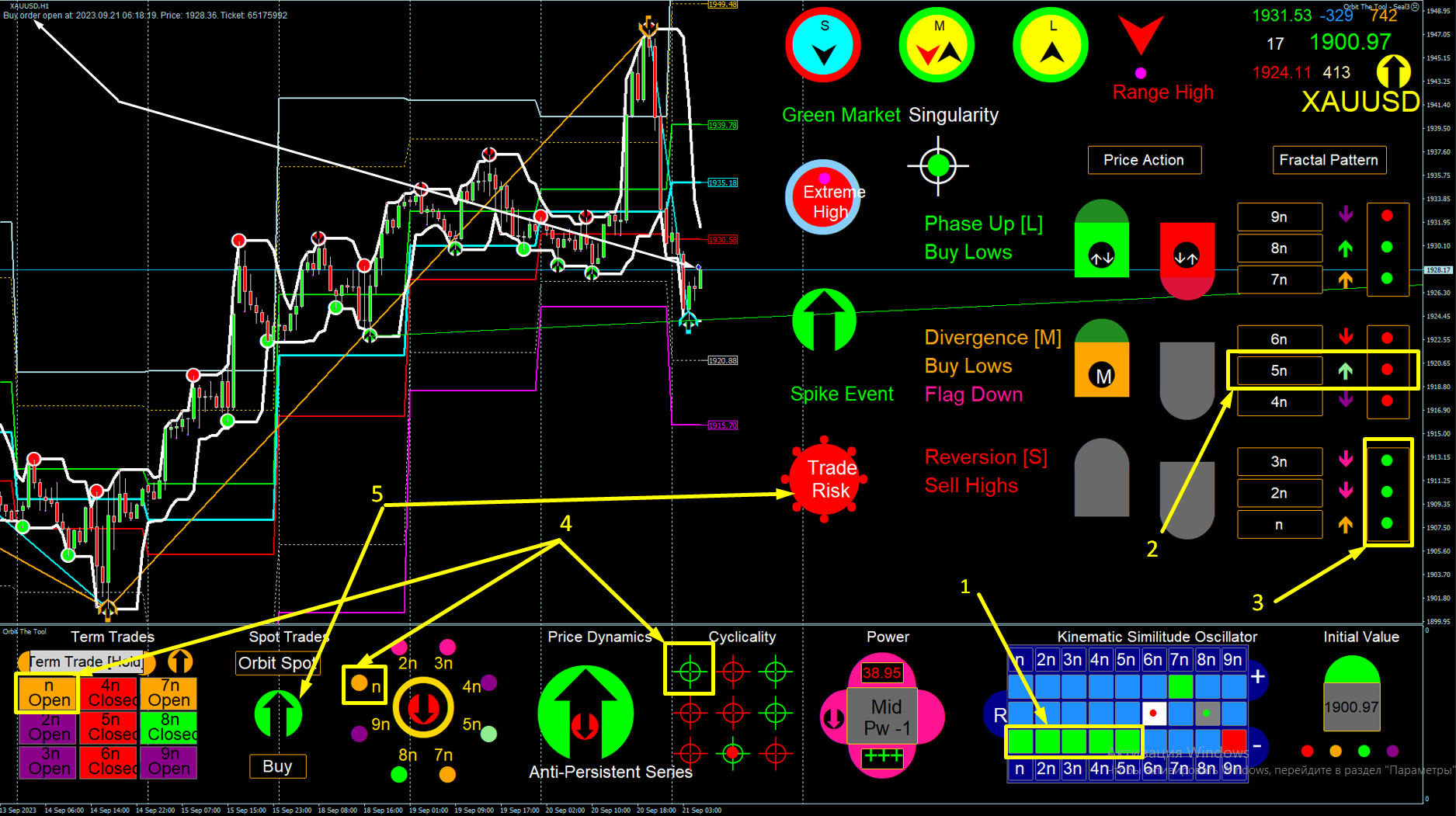 2 - in the Fractal Patterns section we see that 5n has begun to pullback upward (as indicated by the red dot - the direction of the trend (down) and the light green arrow - the direction of the moment in the partition (up)