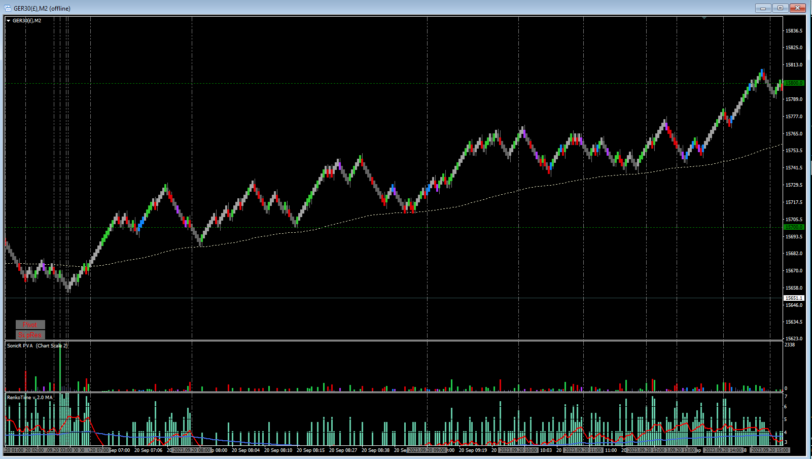 Volume histo bars show high volume over time, note the relation between volume height histo and 'time to form' histo bars, so high volume histo bars might mean high volume with high volatility or high volume after a protracted battle between buyers and sellers lasting a long time before the pip brick size has been achieved.