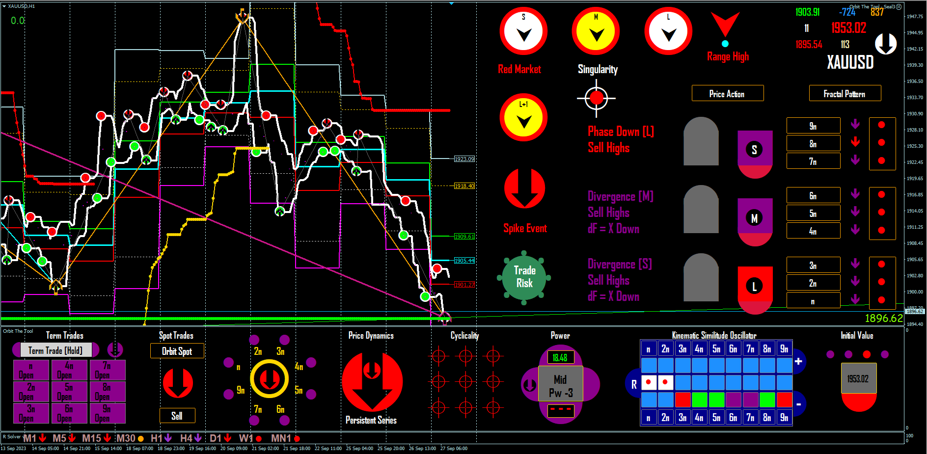 Gold as seen from the 5n window remains persistent down across all of space. The mismatch between 5n/6n diagonal deepens as the fall has deepened . No indications of a turn up at this point so we still selling highs in range (e.g. 4/5n pivots).