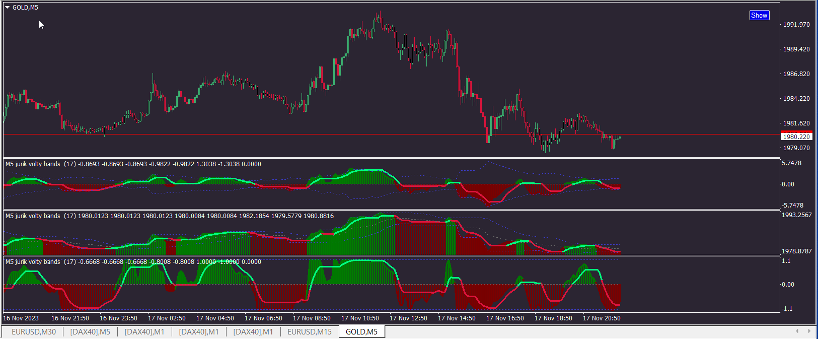 Jurik Volty Bands (Separate) with Color Change on Slope Options, MA Filters, MTF, Arrows & Alerts