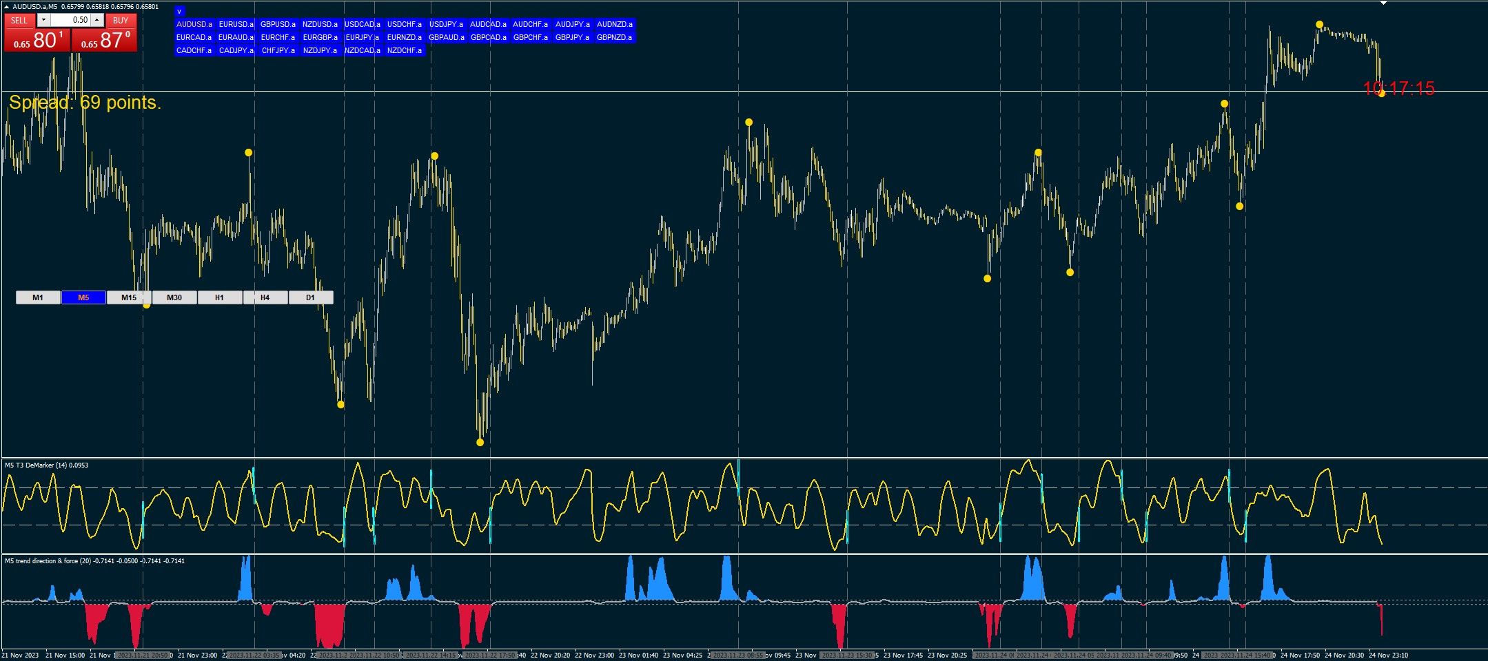 Thank you very much for taking the time to do that. I tried to show in the picture how well it gives signals when it crosses the back over the 30/70 line in conjuntion with other indicators or even divergence/candlestick patterns (In the picture I have trend direction & force plus the second semaphore of 3.) With some Discression and good RR and I have made good pips with it this week on the AUDUSD. Its not a mechanicle system etc (remember semaphores move) however I believe the demarker will help any system.