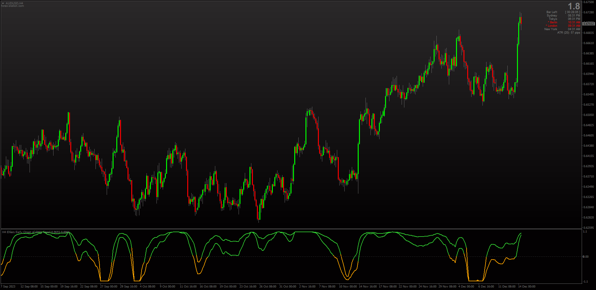 Ehlers's Early Onset Trend uses Ehlers's Roofing Filter (High-pass + Super Smoother filter that's normalized) to create a complex code to eliminate lagging signals. Thanks to Mrtools & ixion700 a new, updated version with MTF & more is available, here: post1295529624.html#p1295529624