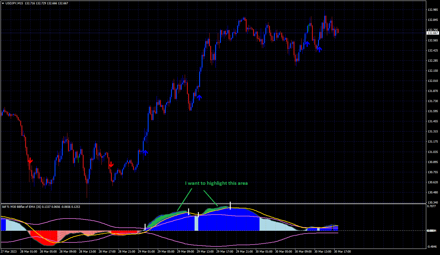 2) It is possible to highlight this area with color or vertical lines, maybe arrows (and alerts). That is, I need to highlight this area somehow - after the bollinger breakdown and before the signal line crosses (second picture).