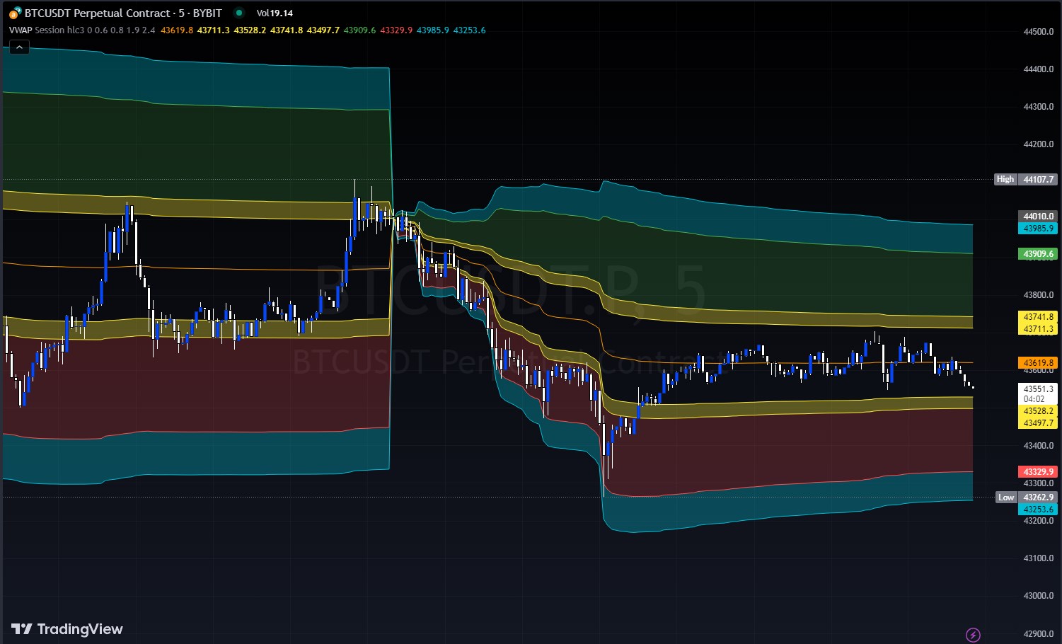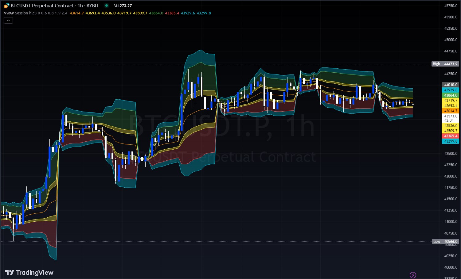 If hiding for timeframes of 1D and above is not set, the script displays VWAP and standard deviations.