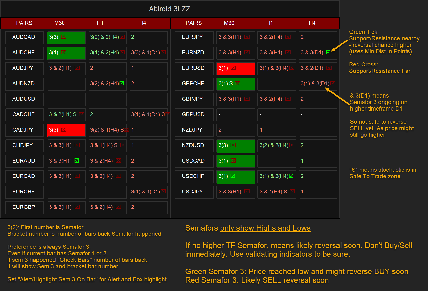 The first is the ABIROID SCANNER to help monitor the ZEE Supports and Resistances and the XARD TRAFFIC LIGHTS.