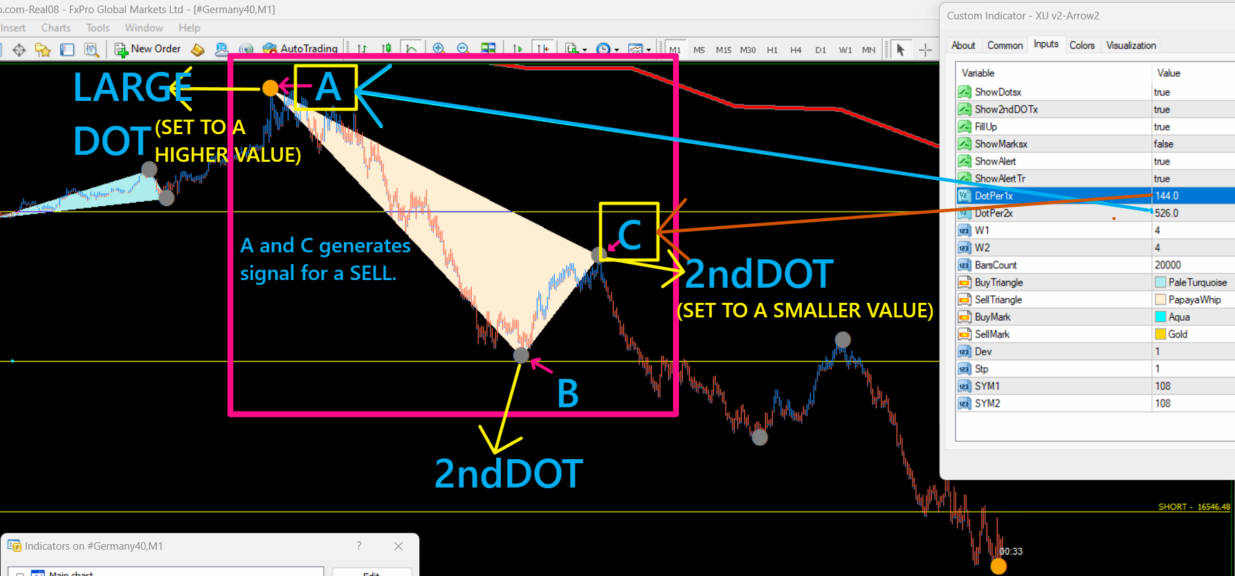 Could you please help with this indicator. It is very accurate when it draws the Large DOT (A ) and the 2ndDOT (C) pattern.