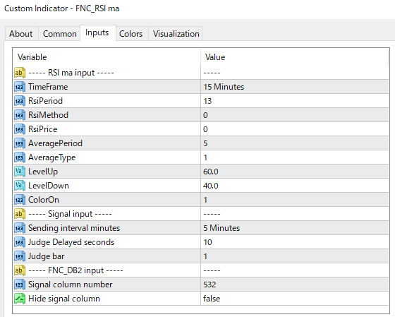 The parameter values for the "FNC_RSI ma" indicator are default values.
