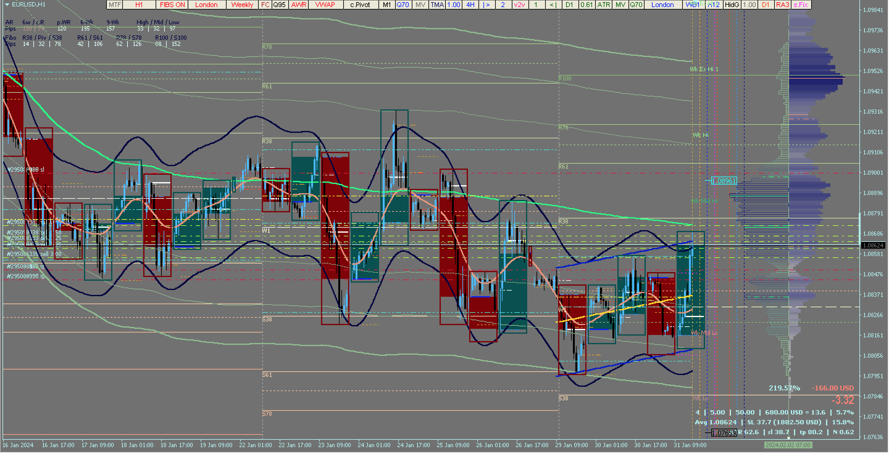 EUR/USD : H1 TF : Weekly VWAP : custom candle H12 : Volume Profile : TMA : Regression Analysis :: new/pending positions...