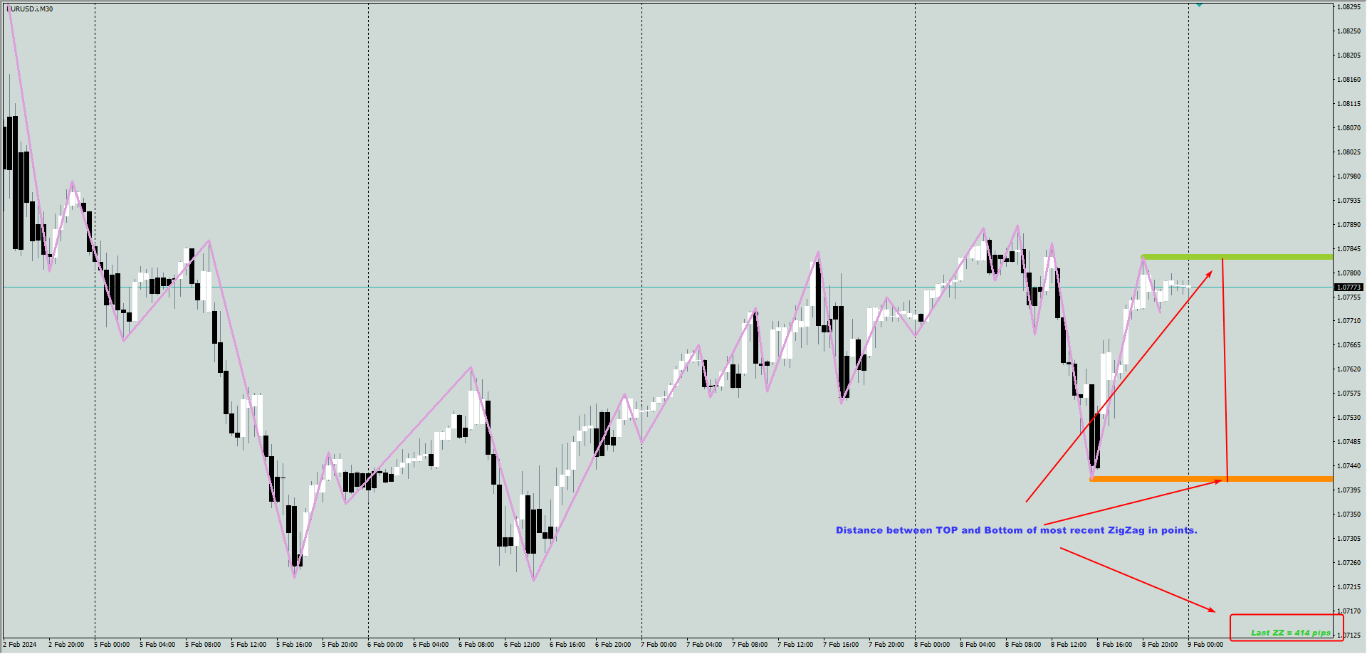 Display in points the distance from top to bottom of last move, can be very useful for breakouts and/or retracements depending on the strategy.